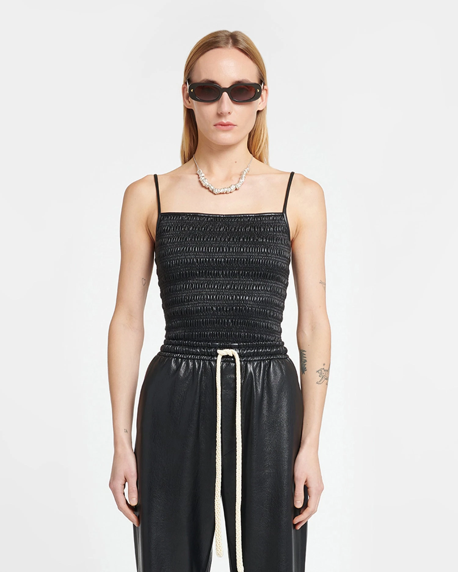 The smooth, lustrous feel of Okobor™our exclusive alternative to leather – is reborn for Resort 2024 with a tactile, densely ruched effect. The smocked finish of the Arenda top accentuates its figure-sculpting silhouette. Thin spaghetti straps are classically elegant.