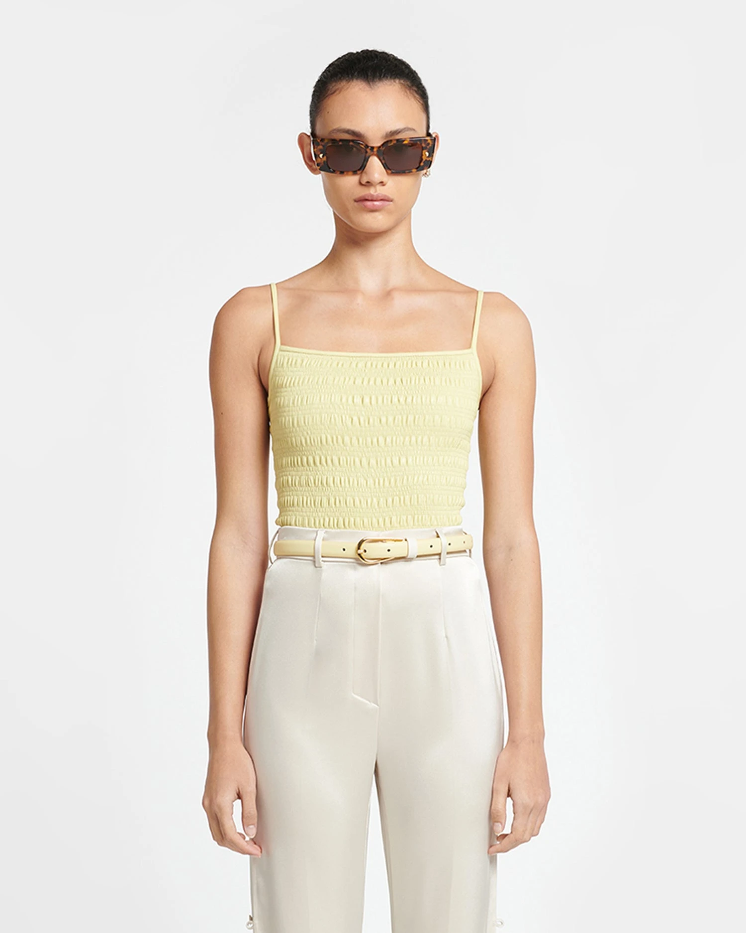 The smooth, lustrous feel of Okobor™our exclusive alternative to leather – is reborn for Resort 2024 with a tactile, densely ruched effect. The smocked finish of the Arenda top accentuates its figure-sculpting silhouette. Thin spaghetti straps are classically elegant.