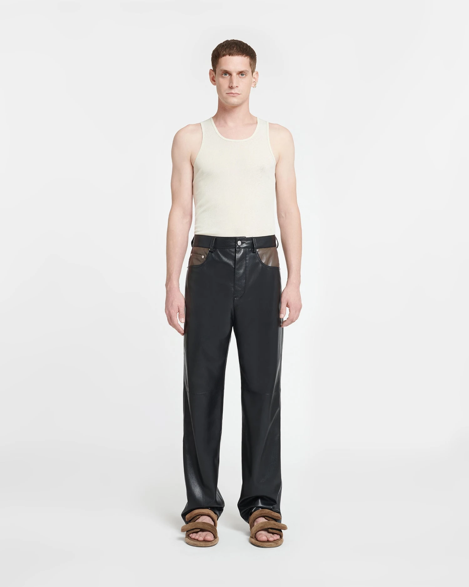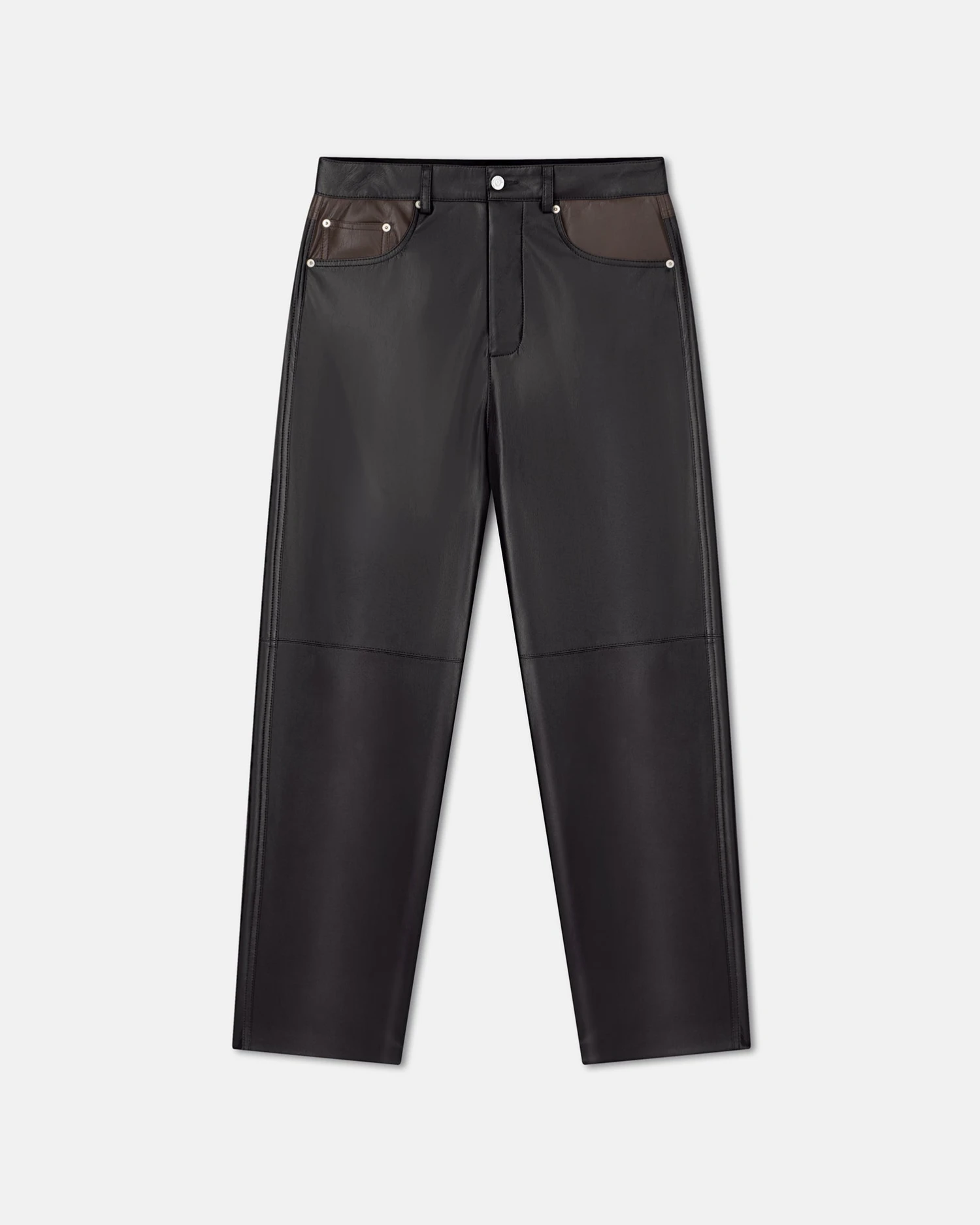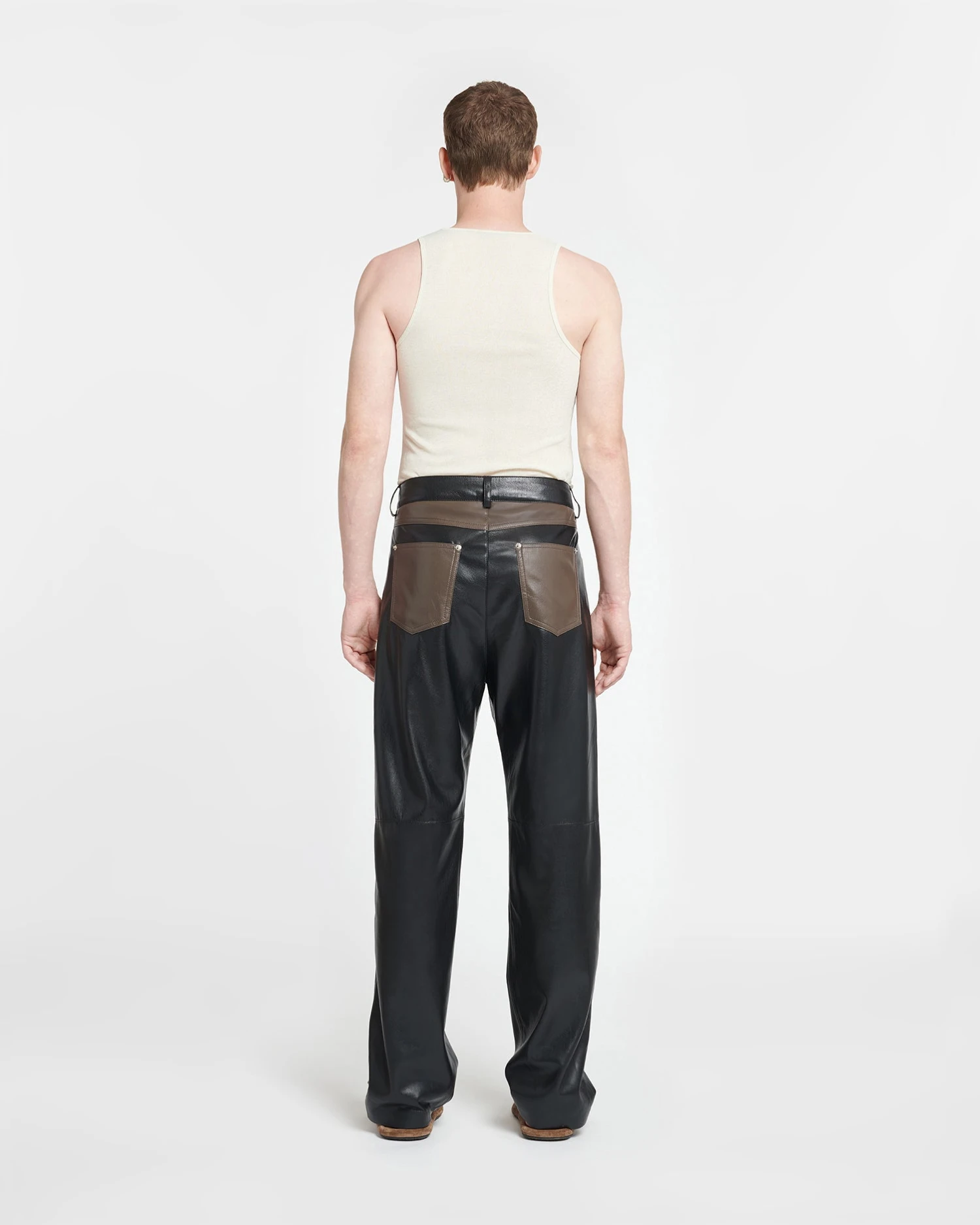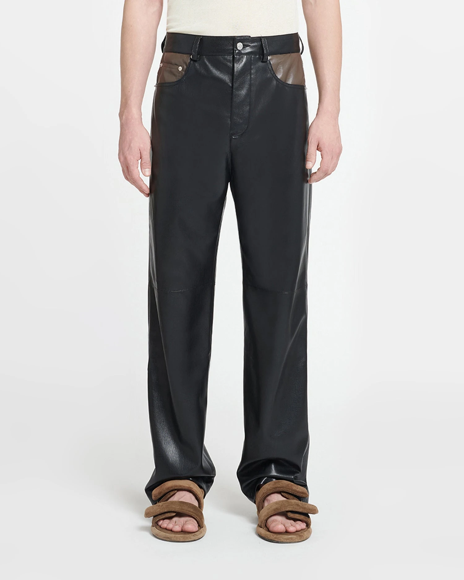 The Aric pants have a classic construction with belt loops, but are crafted from our innovative Okobor™ alt-leather for a contemporary feel. Slim and straight in fit, they come in a western-inspired patchwork of shiitake and black.