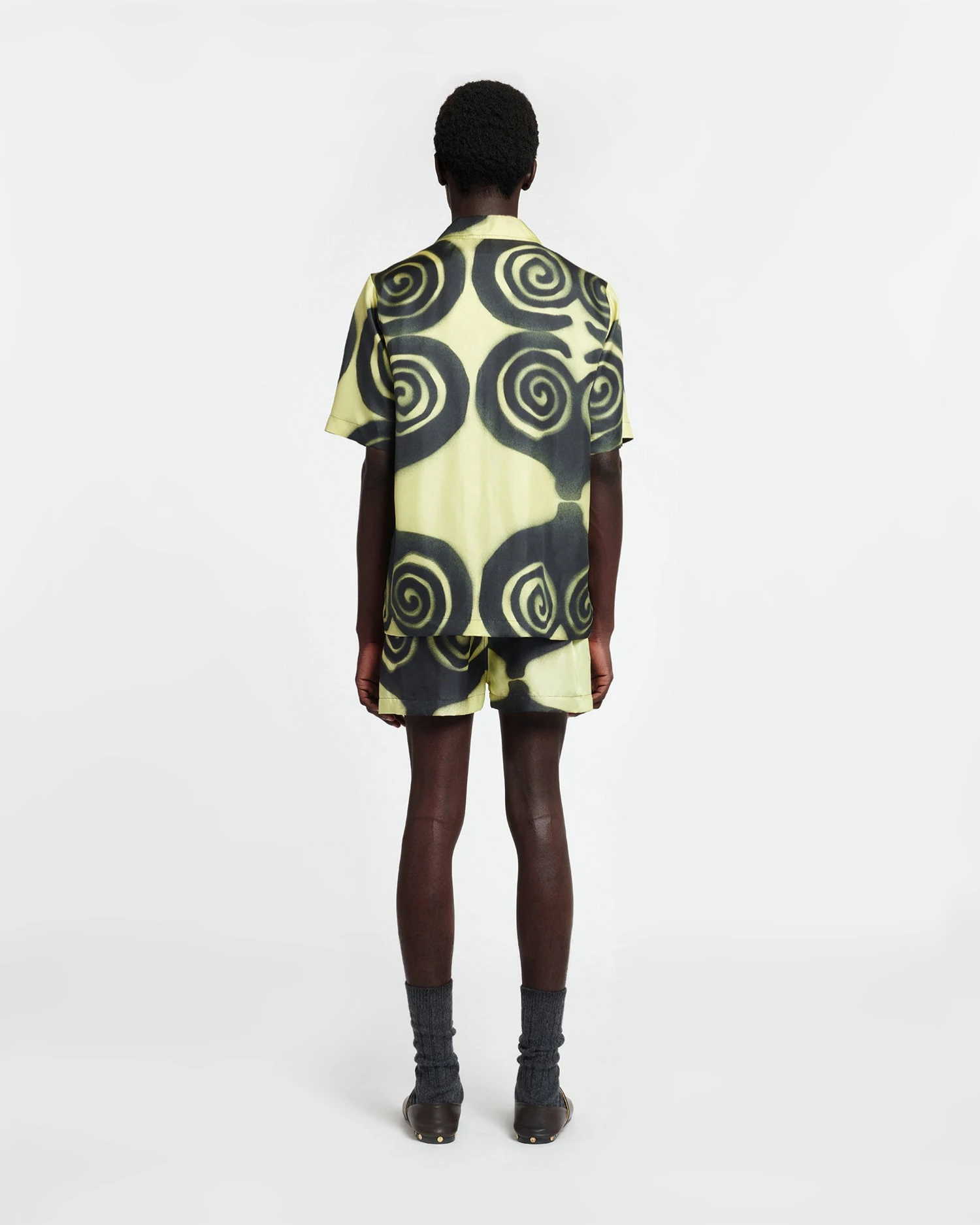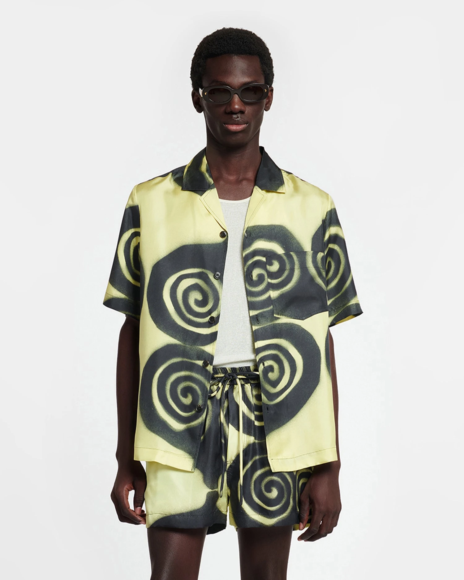 Structured and short sleeved, the Bodil shirt is a timeless style given a contemporary update with a spiral motif, a symbol of circularity inspired by a Late Bronze Age plaque found in the Hungarian National Museum. It is crafted from silk twill, and features a single patch pocket, open camp collar and a laid-back cut.