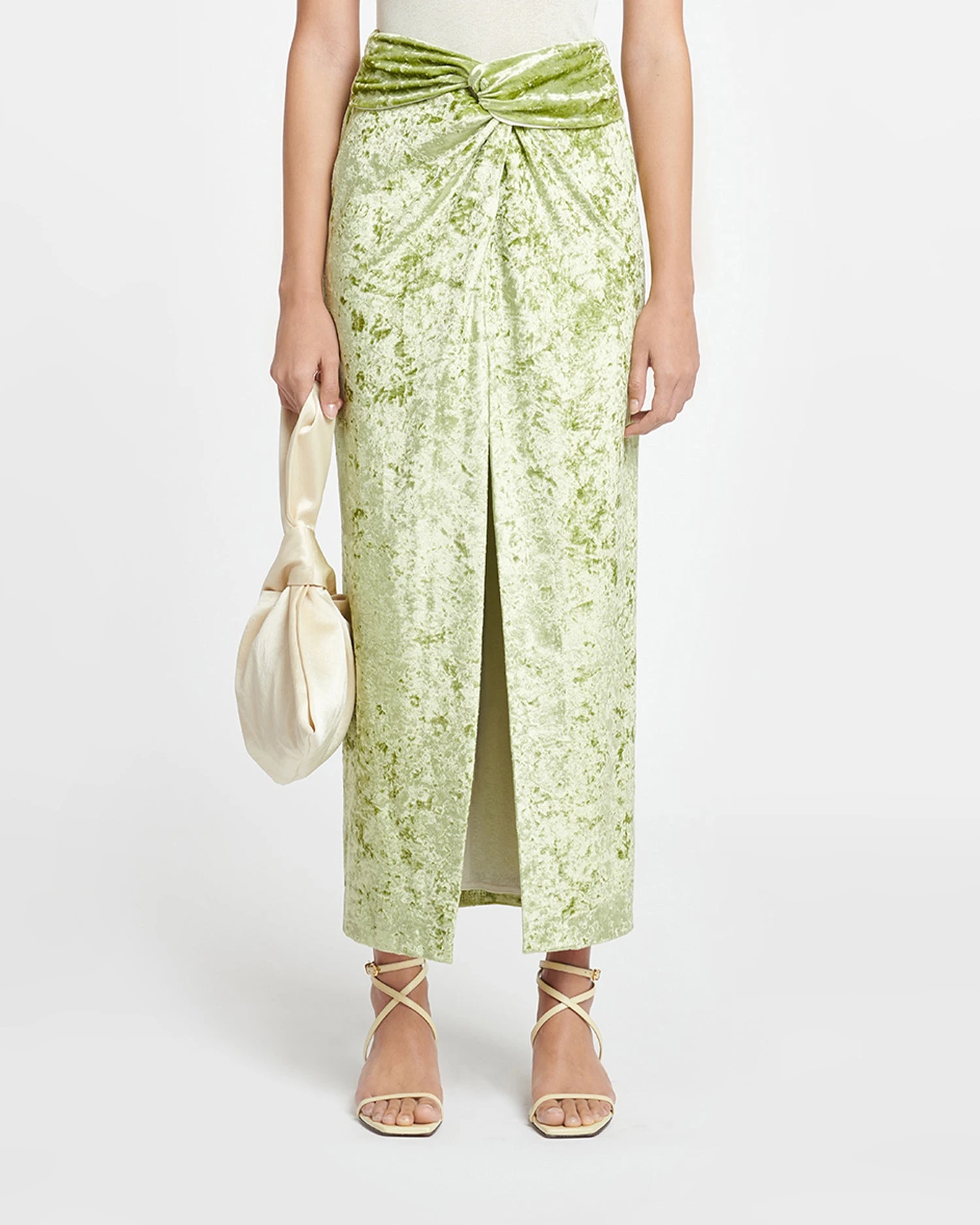 The Carlene midi skirt has a sarong-style silhouette made from plush crushed velvet. It is minimally detailed to keep the focus on the elegant framing of the waist and sage hue.
