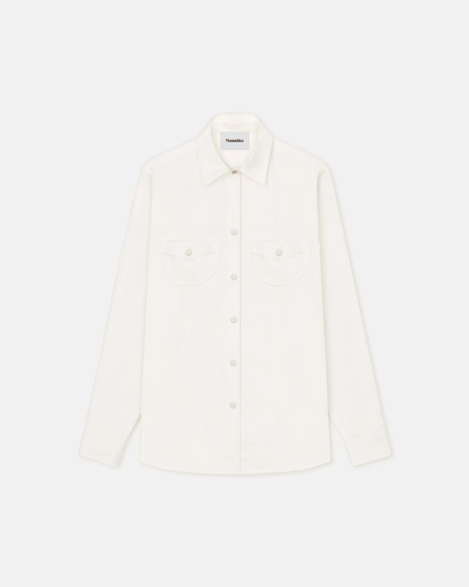 The Corinna shirt juxtaposes utility with sculptural detail. Made from super-soft twill, it is distinguished by cupped seam pocket details at the chest. It has a relaxed fit sharpened by seam details.
