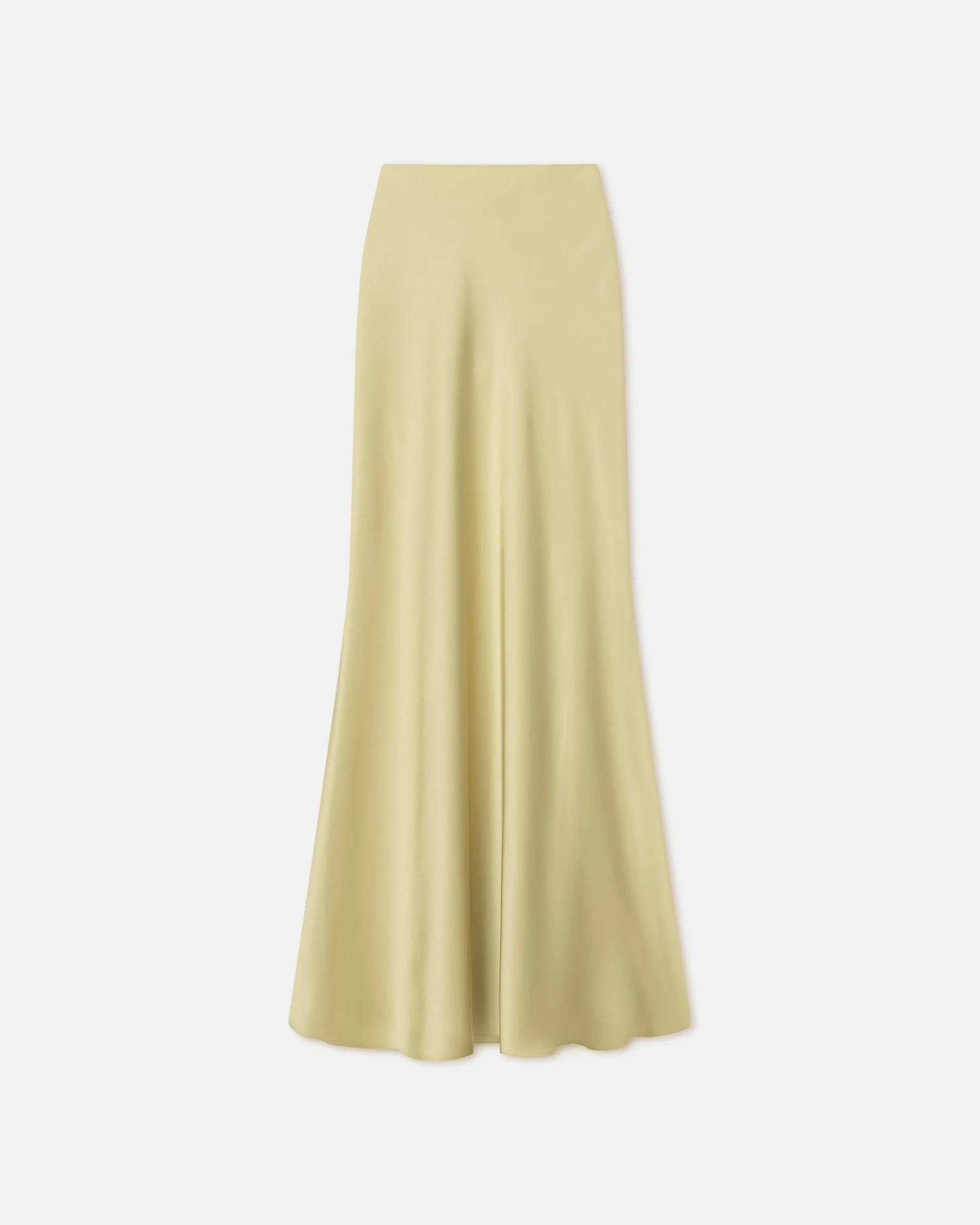 The Fea skirt is cut from our signature slip satin that pools beautifully over the feet in a fluted hem. Effortlessly elegant, it sits high on the waist and comes in a lustrous lime yellow tone.