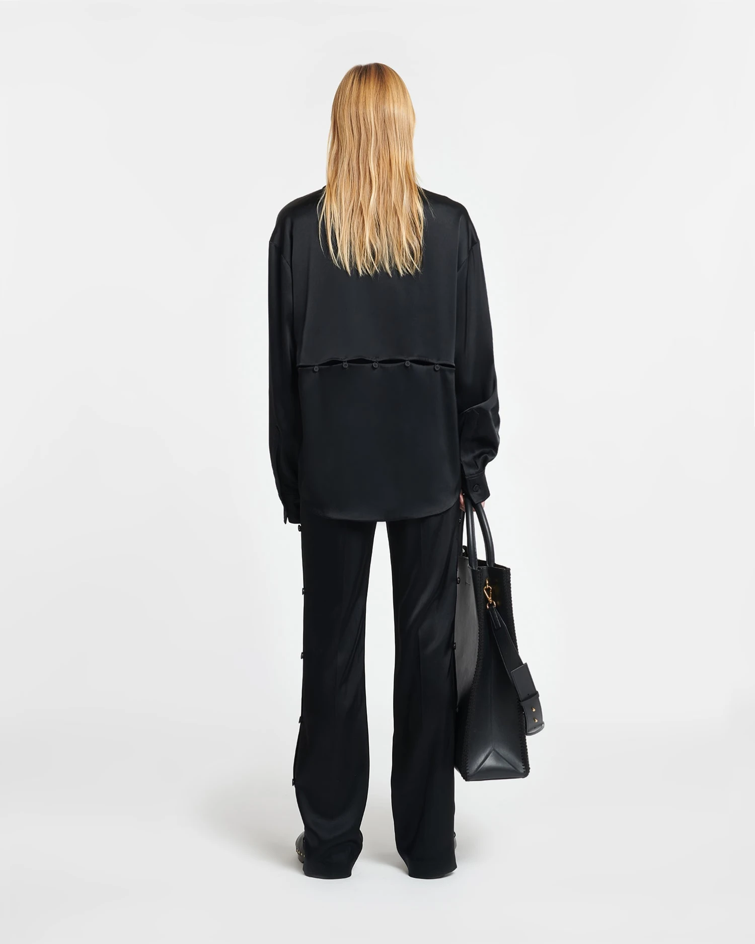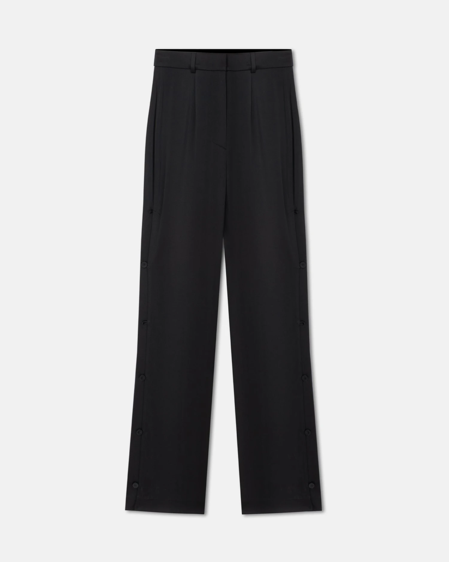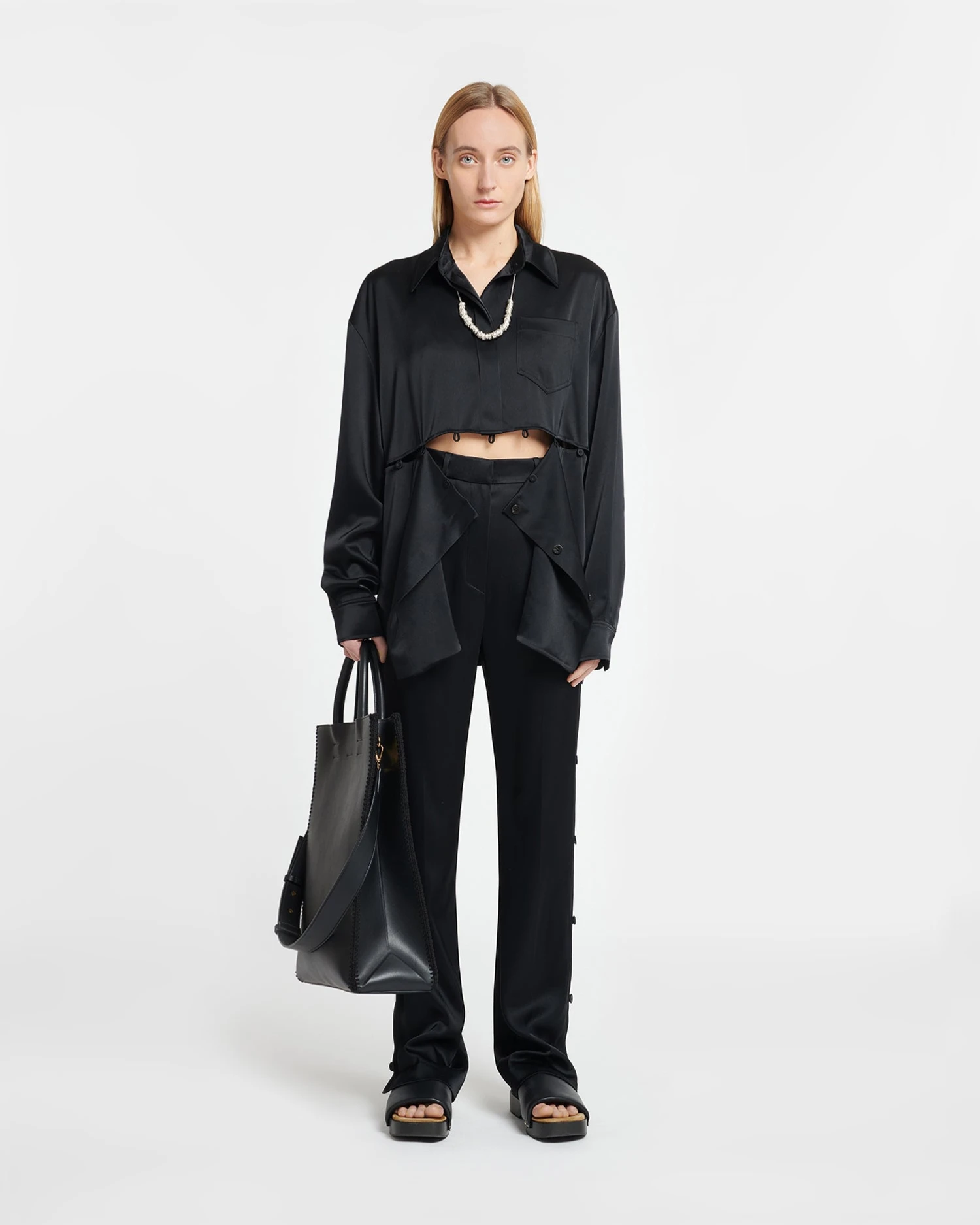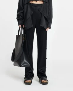 Decorative modularity is a core part of our design philosophy. Crafted from our signature slip satin, the Felina pants can be unbuttoned down the sides to create a more exaggerated slit-front silhouette.