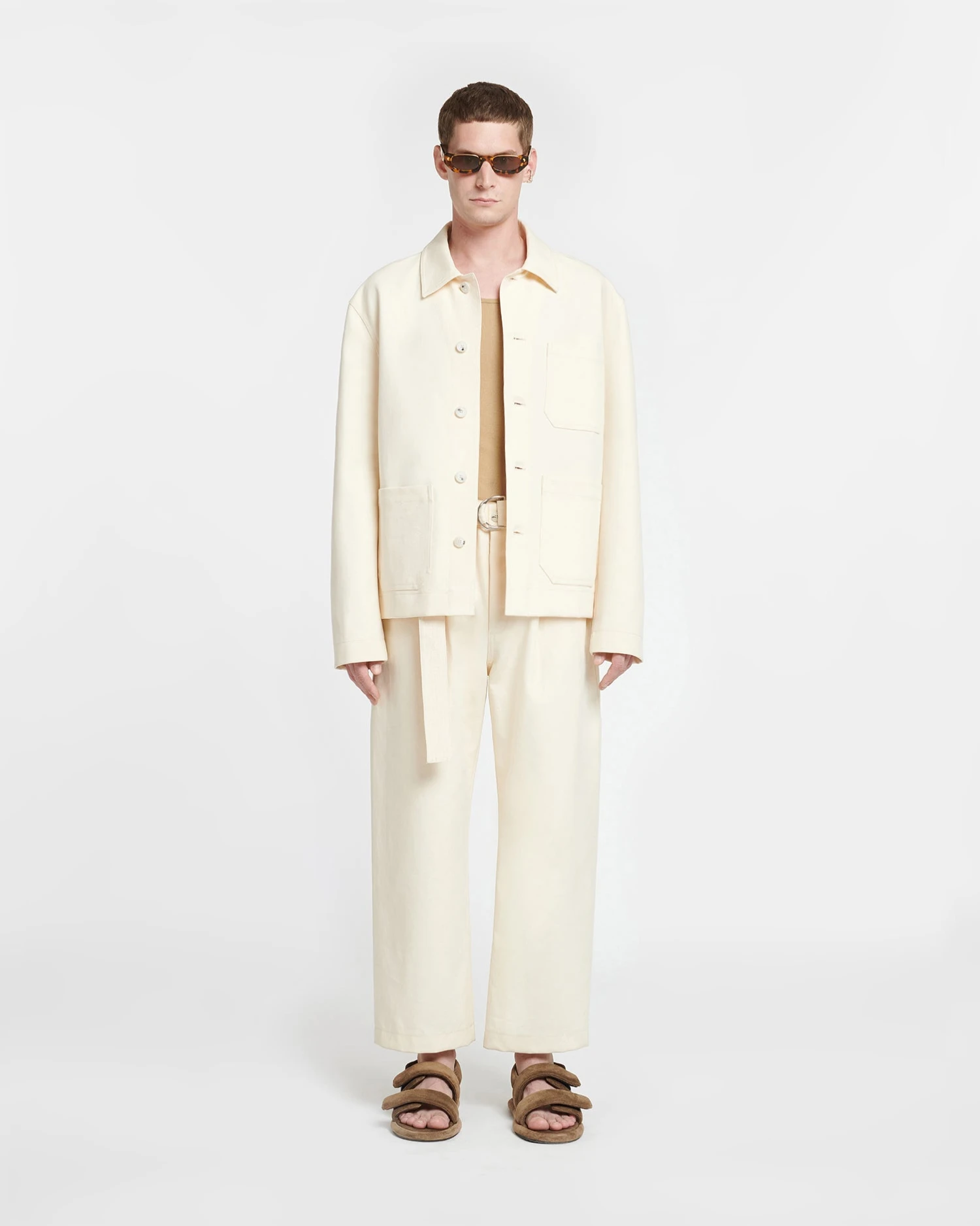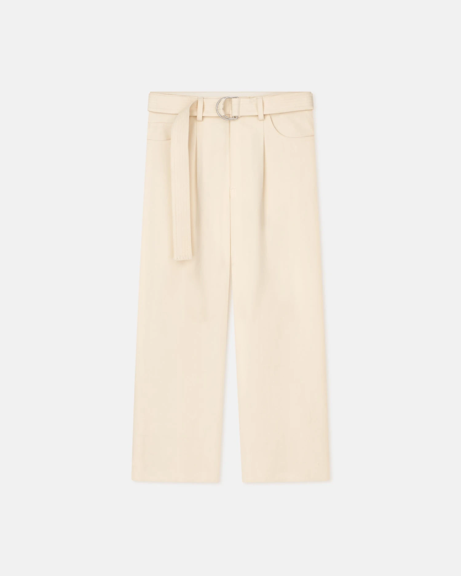 The Ferre pants are cut to a barrel silhouette that’s anchored by a matching belt. They’re made from structured twill in a creme hue and will work just as well with a casual tee as they will a sharply tailored shirt.