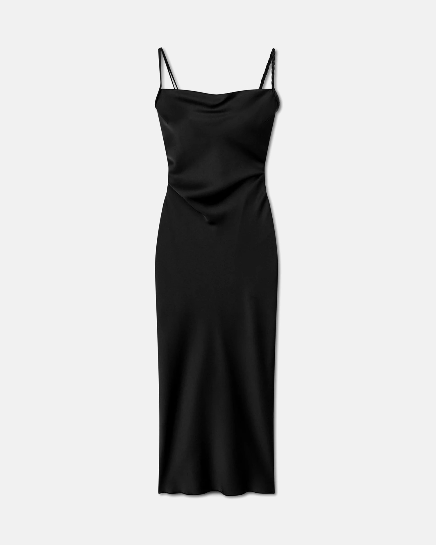 Glossy black slip satin takes the column silhouette of the Fiore dress to elegant new heights. It falls from slender spaghetti straps to an ankle-length silhouette.