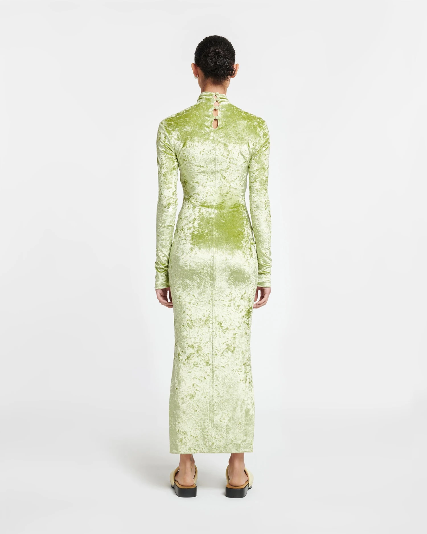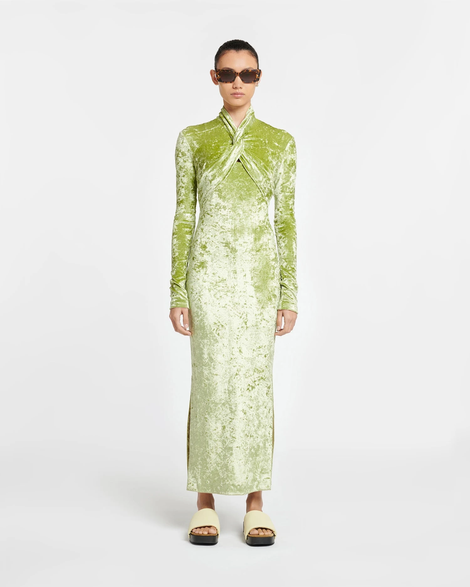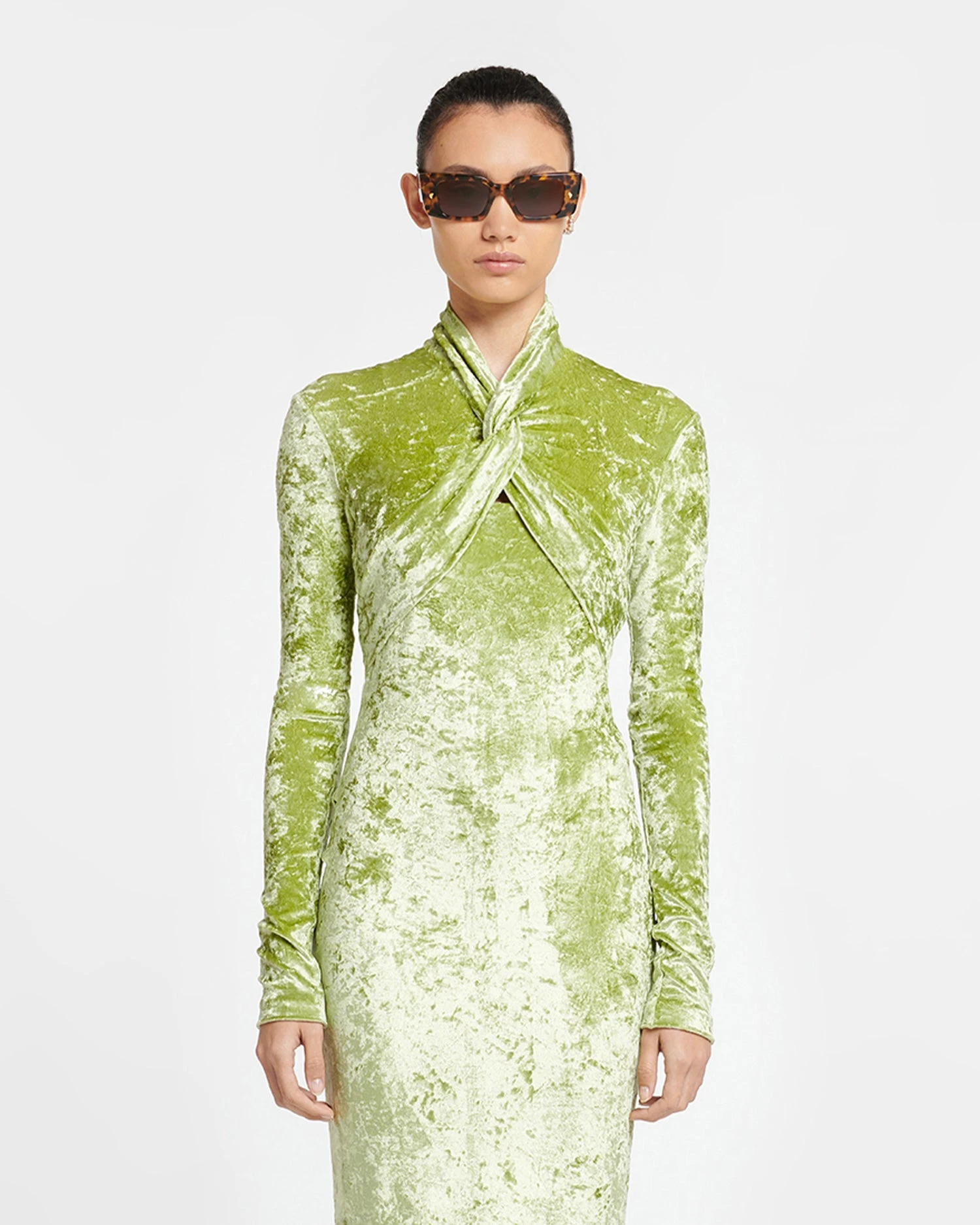 The Franci dress is detailed with a flattering twisted panel. It is made from crushed velvet for a densely tactile finish and fits close through the body.