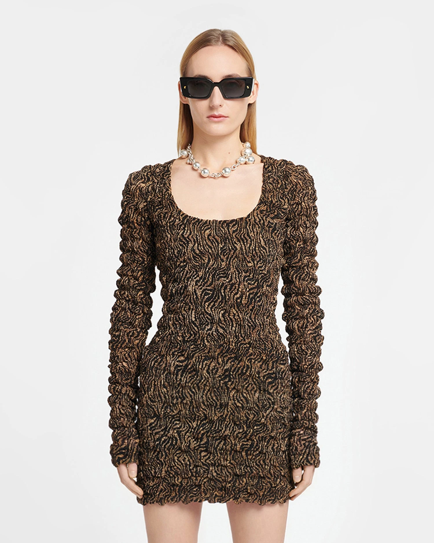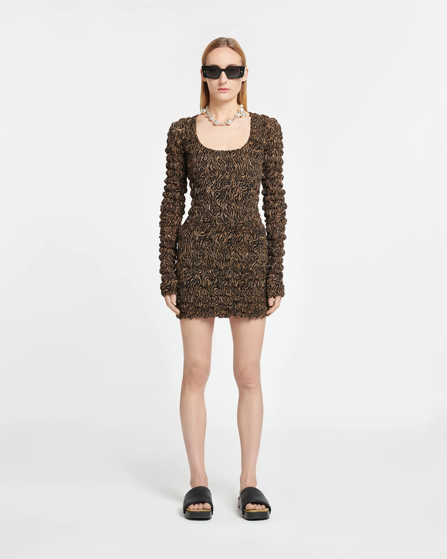 The Frensi dress is crafted from a deadstock chiffon fabric that is smocked to create a distorted zebra print. It fits close through the body and is finished with an elegant scoop neck.