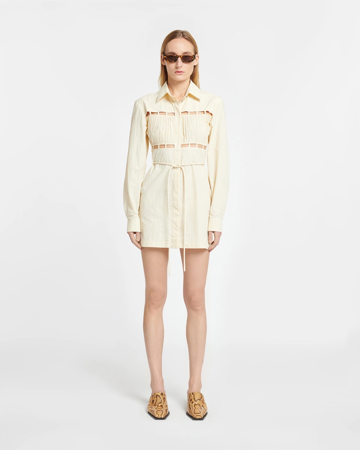 The Genea dress has a pleated front panel to elevate the classic shirt silhouette. It is cut from poplin that is both structured and breathable, and falls to a mid-thigh length.