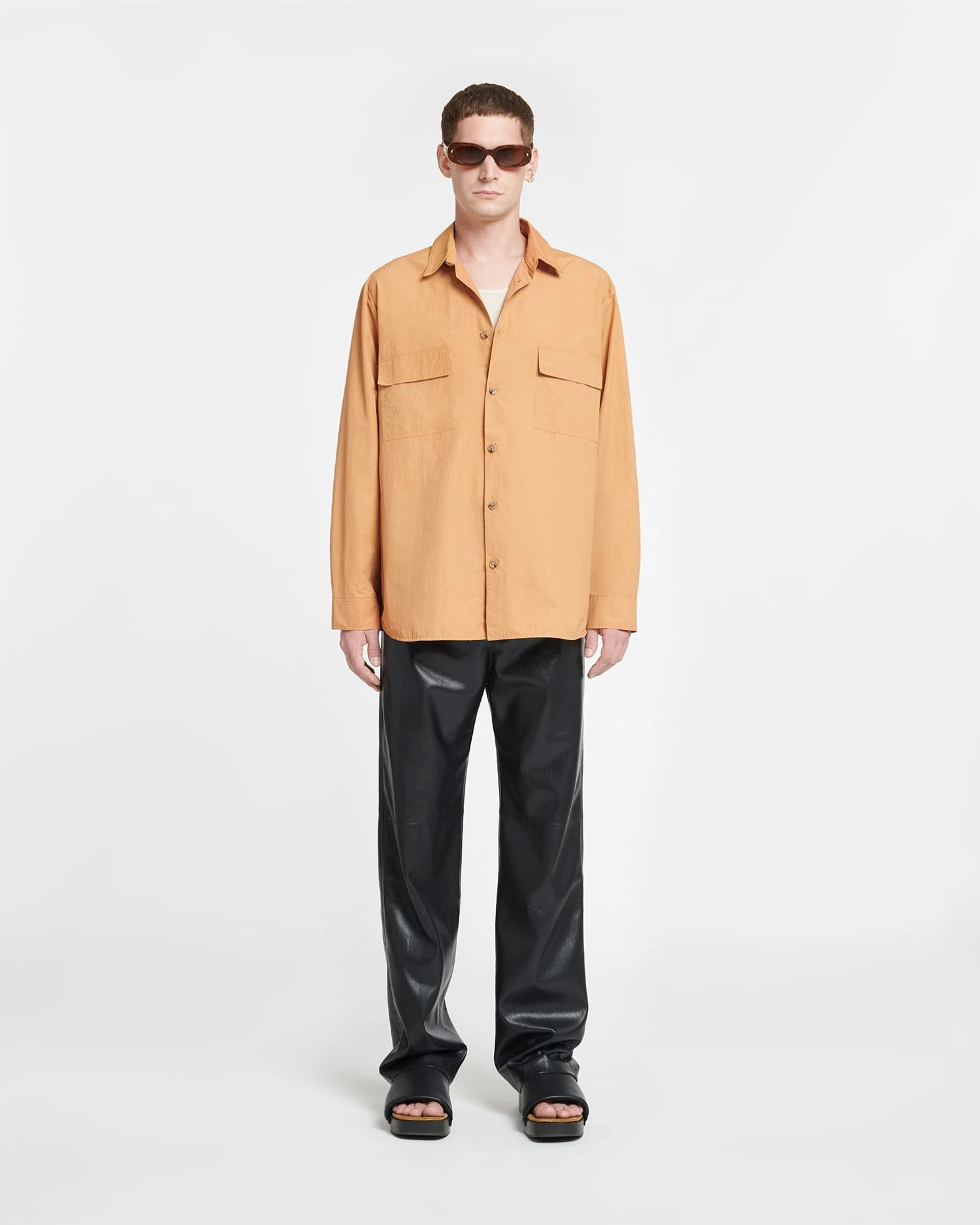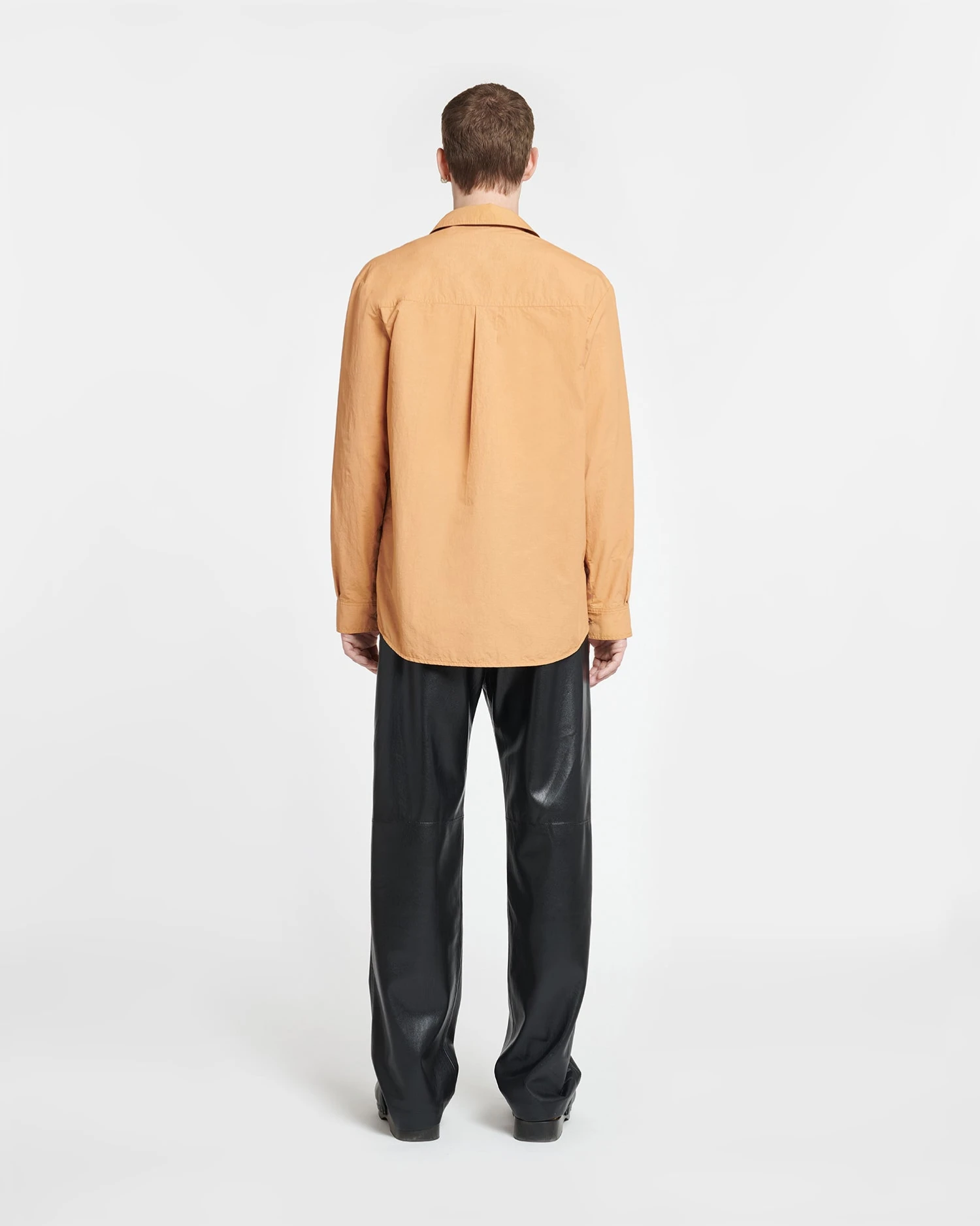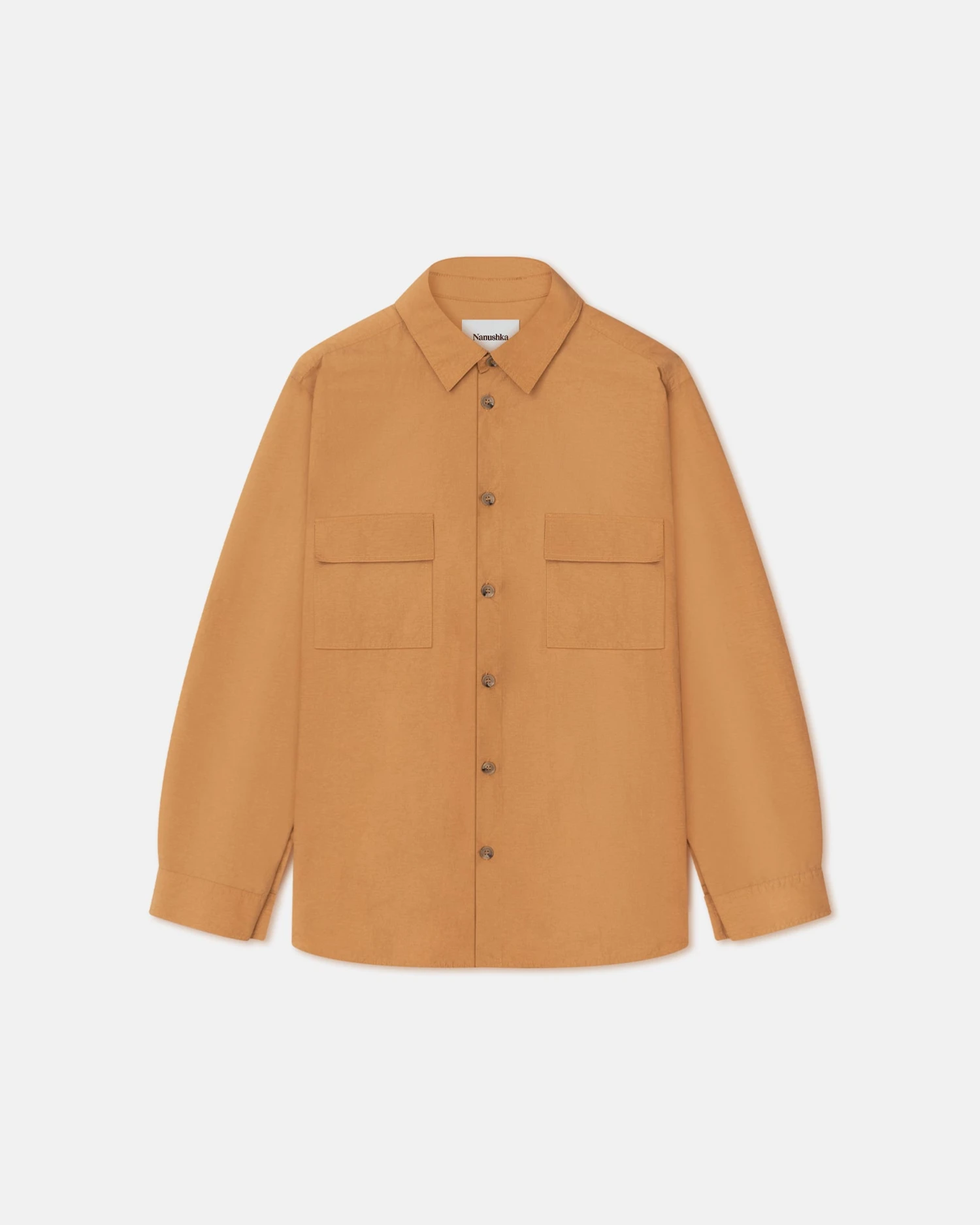 The Jari shirt is cut from crisp tech poplin for an oversized fit. The biscuit tone and curved hem are considered finishing touches.