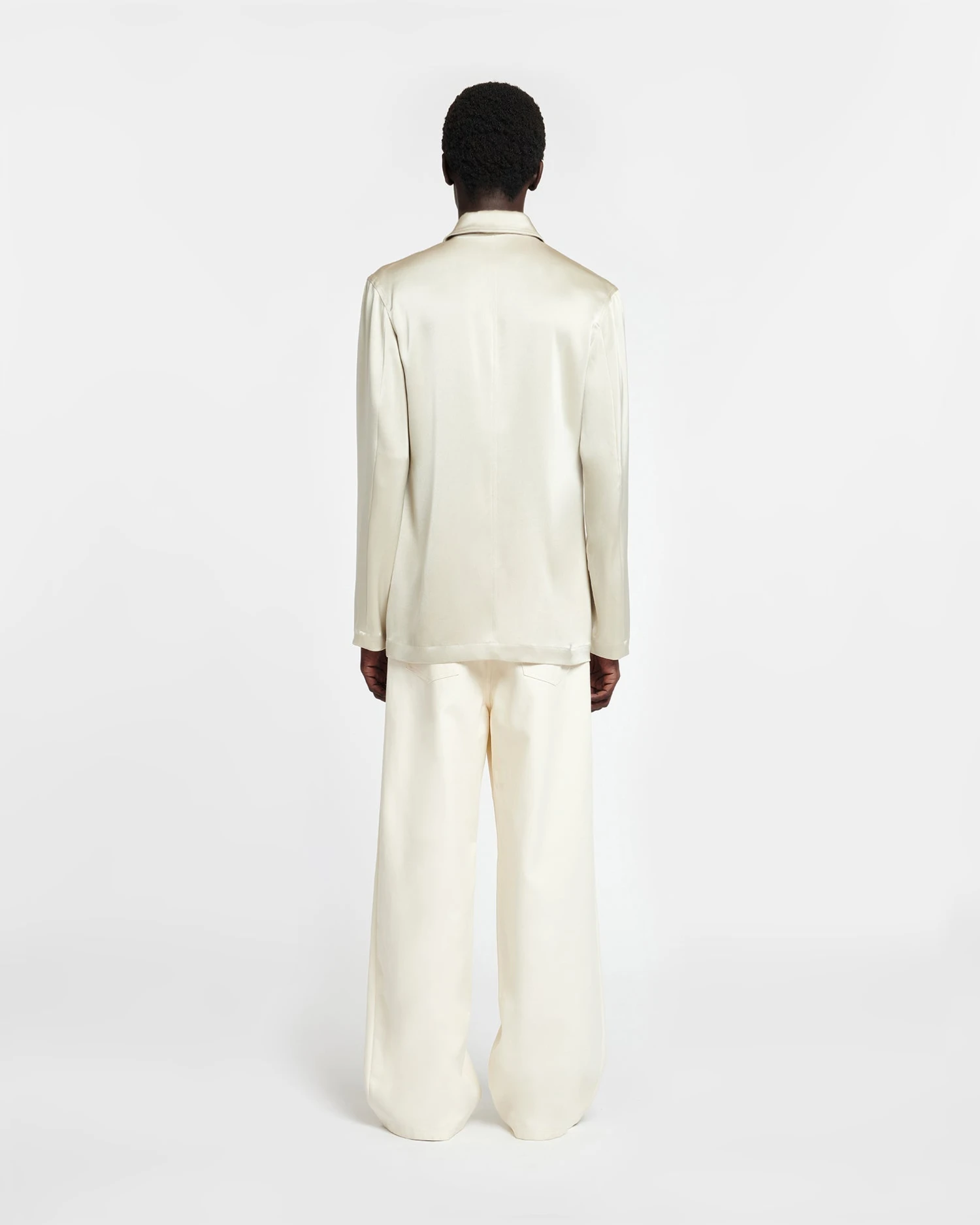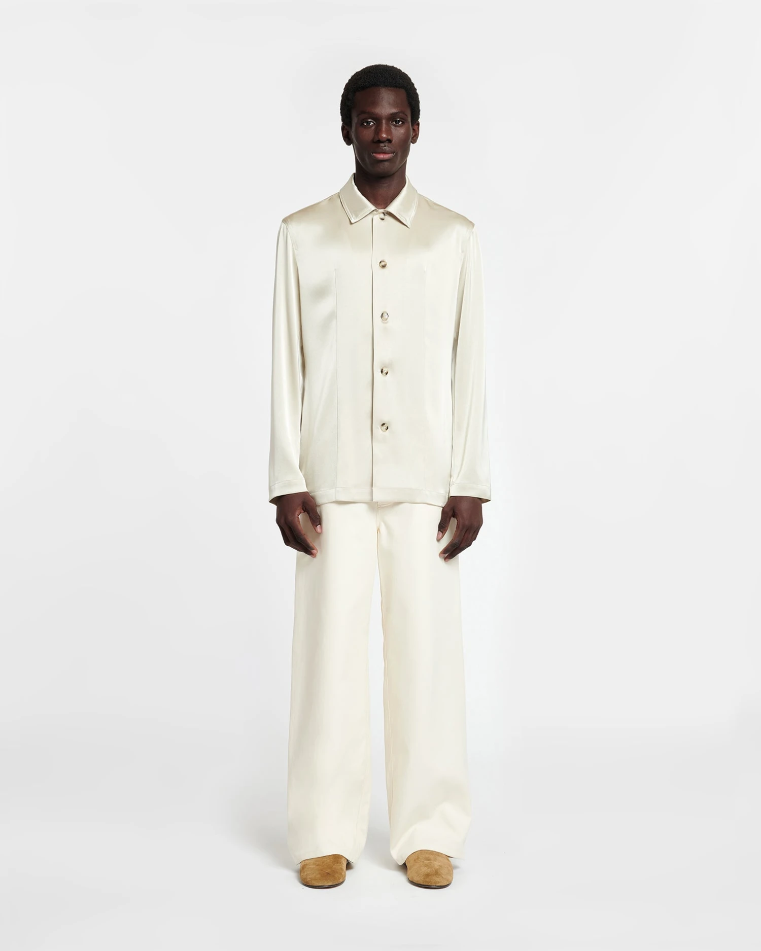 The Jondar shirt is made from slip satin – going against expectations of the fluid, easy-going fabric, it has a streamlined slim fit. It comes in a versatile porcelain tone and is detailed simply with button fastenings through the front.
