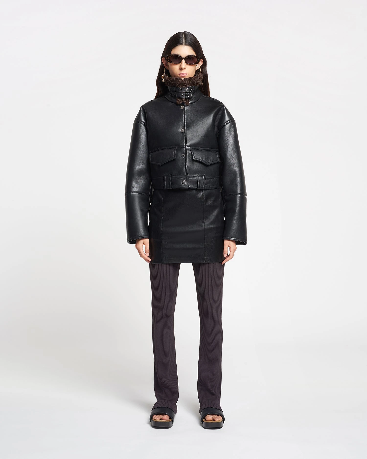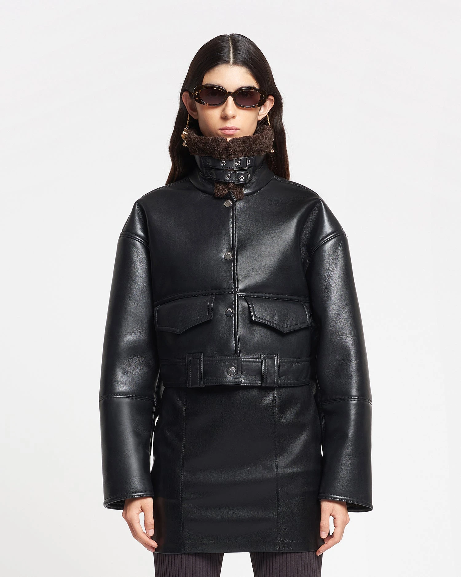 Fusing classic outerwear details into a sleek new style, the Karla jacket is a modern proposition. Itās made from regenerated black leather with a bonded shearling lining in contrast brown, and features a high aviator-style neck and neat pocket flaps.