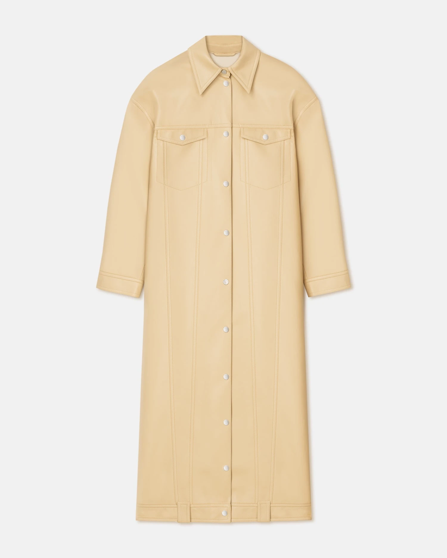The Keano coat is made from vintage-creme regenerated leather – originally unwanted off cuts – for a sleek, streamlined fit. It’s inspired by classic Western jackets, with a sharp collar and button-fastening chest pockets.