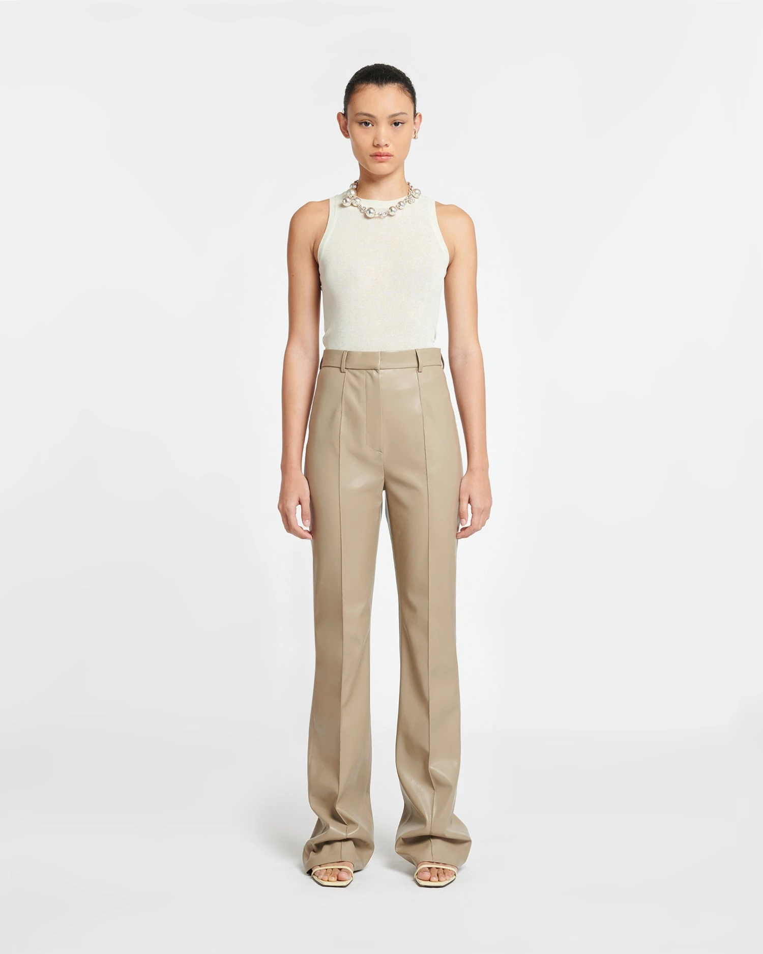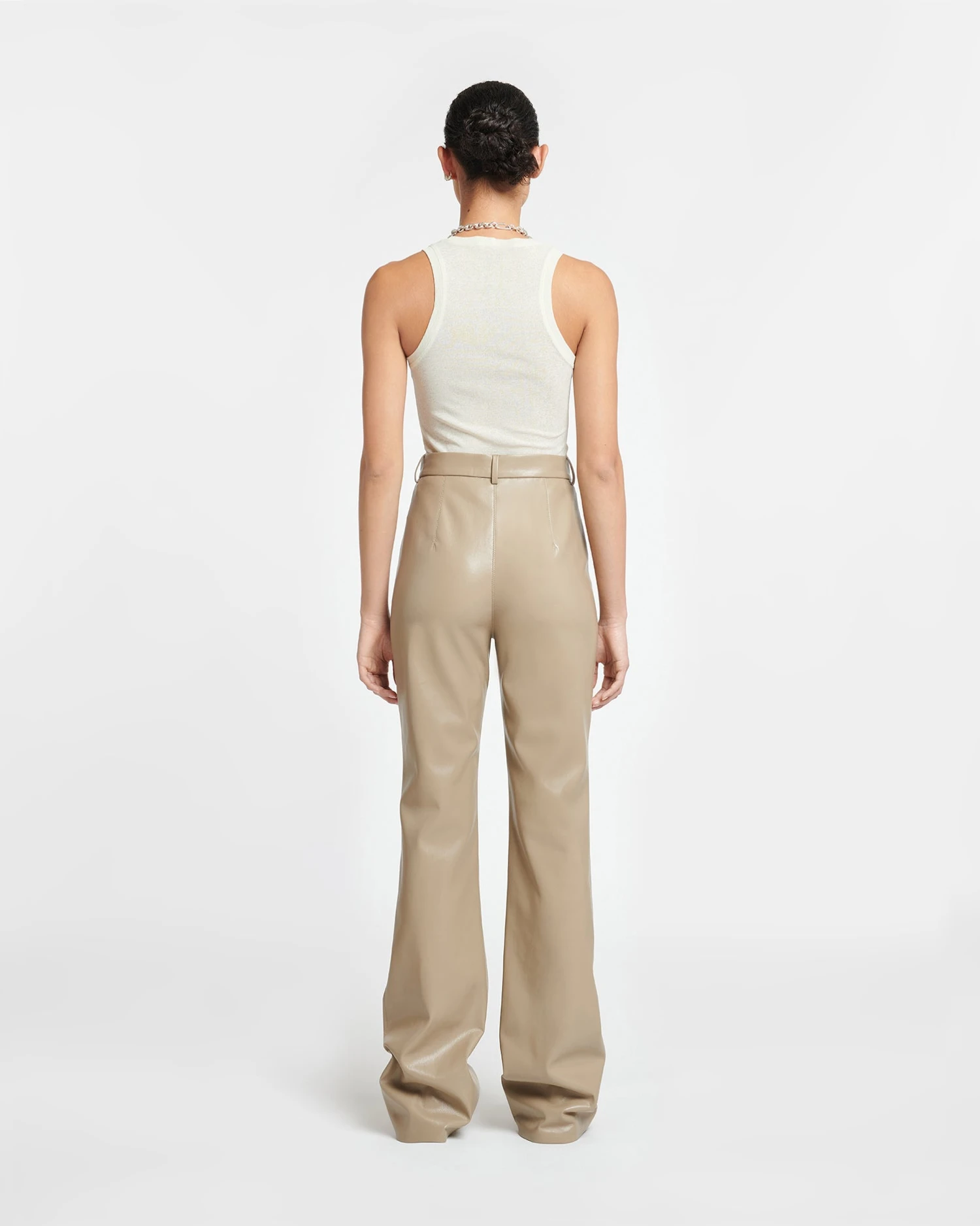 Refined yet relaxed, the Leena pants are made from signature Okobor™ alt-leather with slim legs that pool elegantly at the ankles. They sit flatteringly high on the waist with pressed creases through the front. The ashy-taupe tone is a timeless neutral.