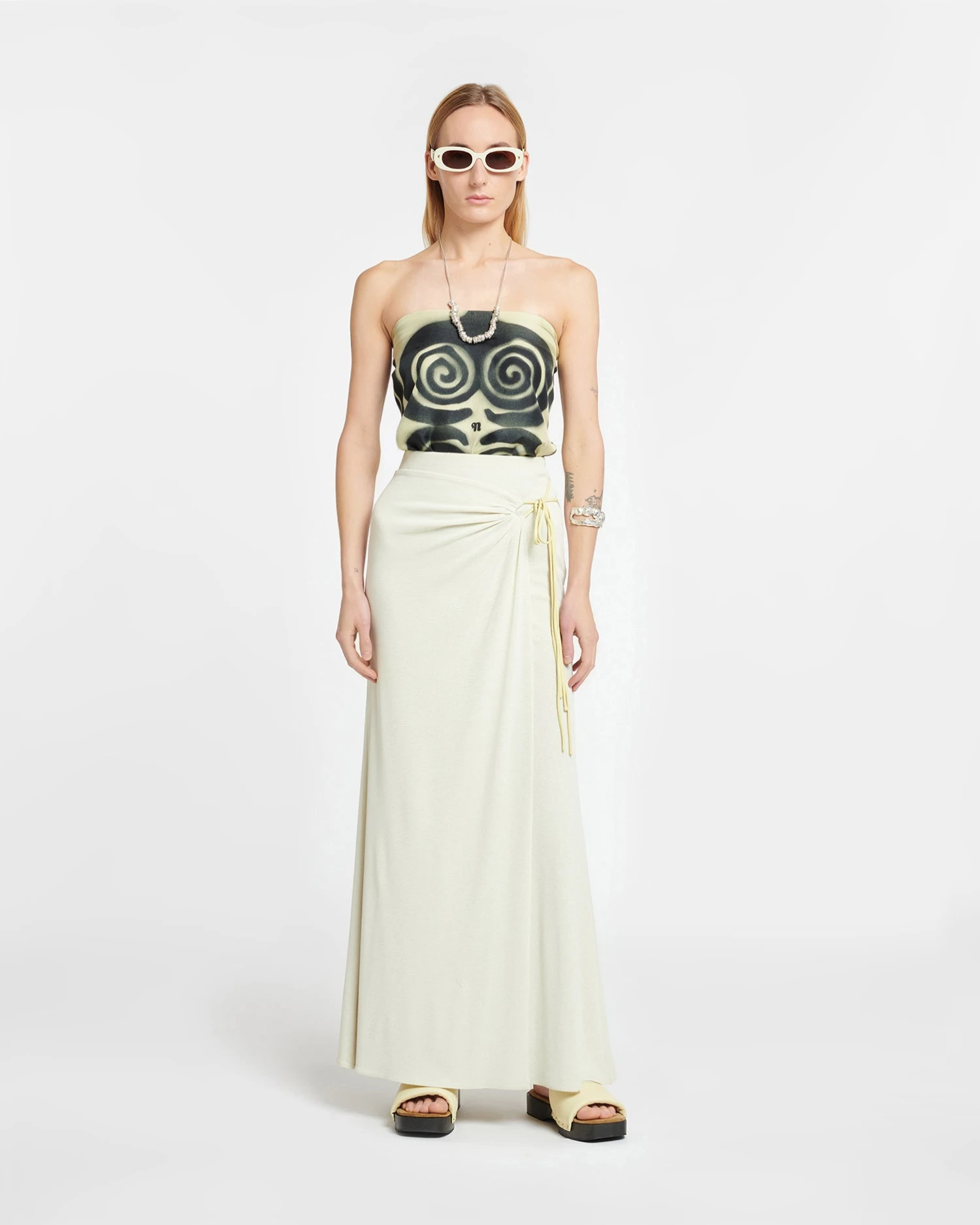 The Macea skirt is made from our signature mesh-jersey fabric – its lightweight structure holds the flattering draped front beautifully. It sits high on the waist before falling past the ankles. Embrace the elegant white wax tone with the coordinating separates.