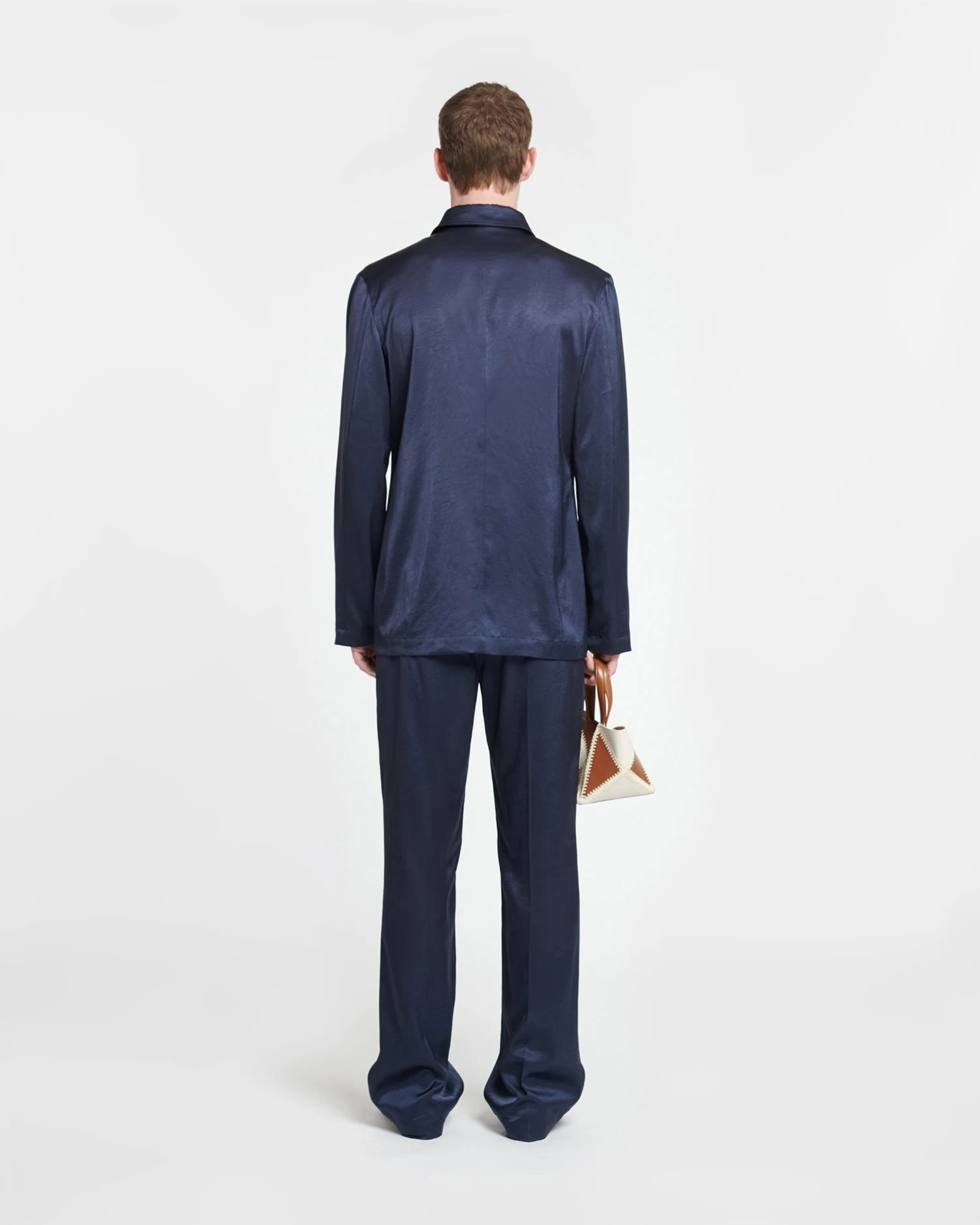 The Macen pants have a classic construction with belt loops, but are made from glossy satin for easy elegance. They are detailed with pressed creases through the front to give volume to the fluid loose legs.