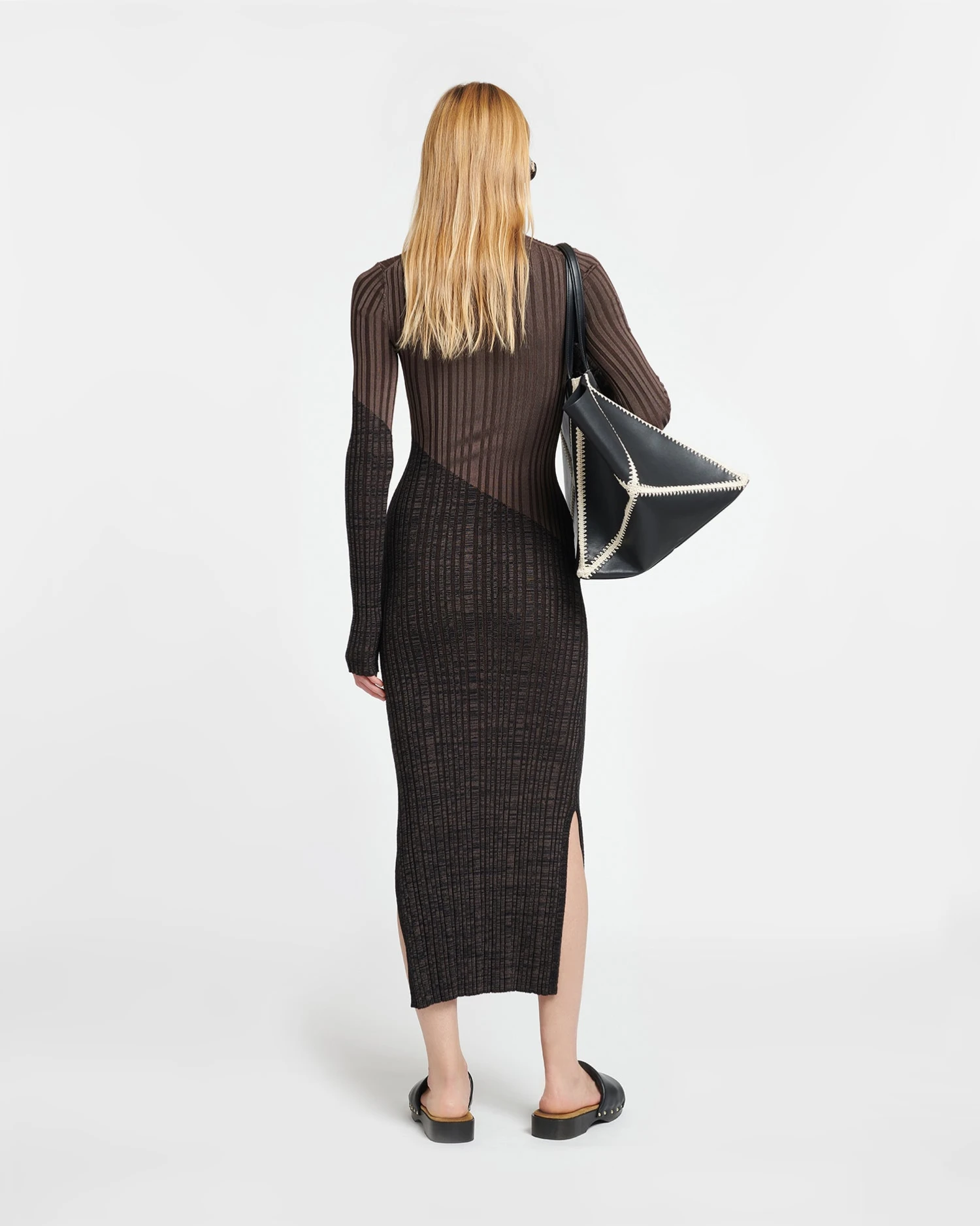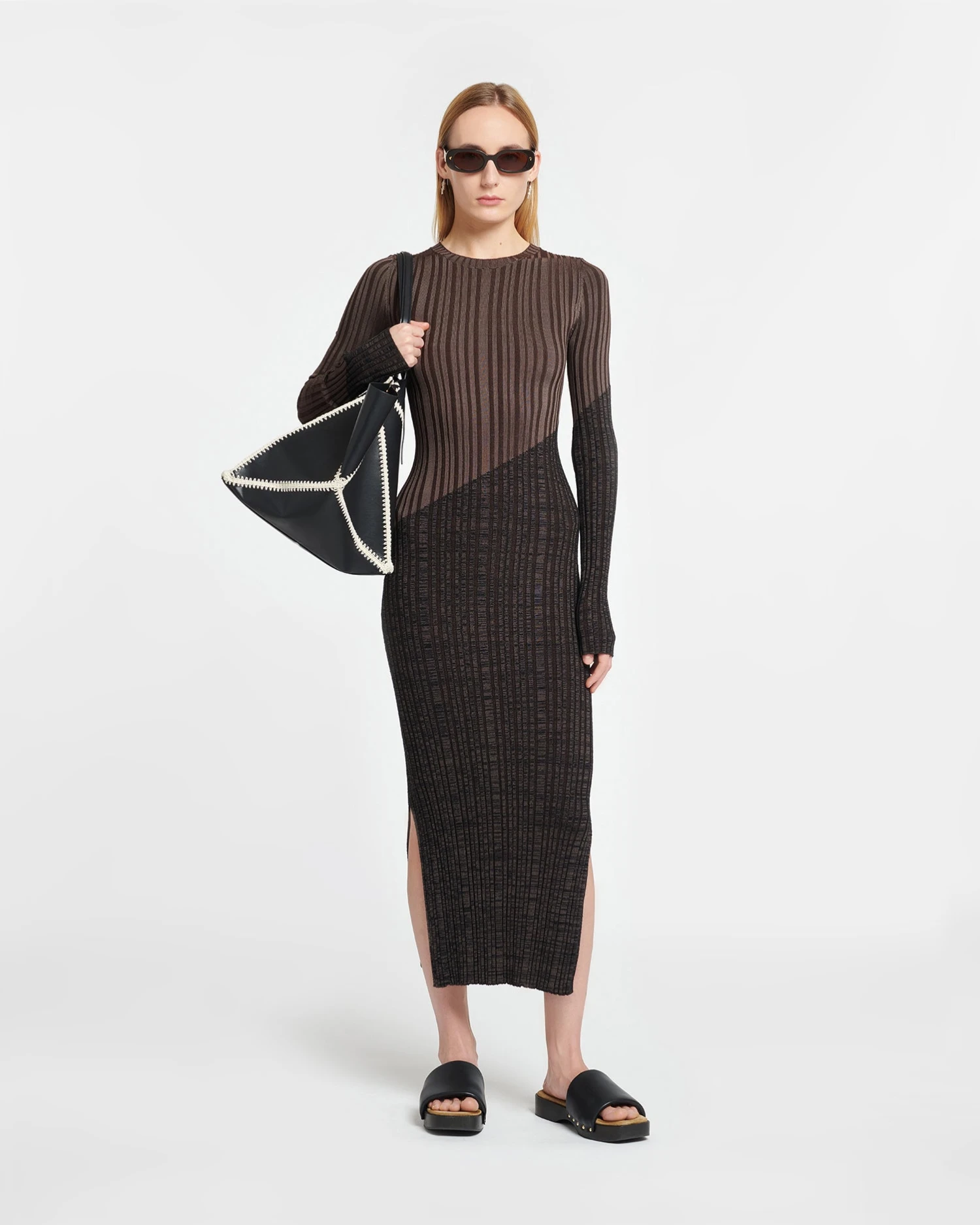 The Maeron dress is rib-knitted with merino wool for a softer, more luxurious finish. It is cut to fit close through the body with side slits for comfort, and has a two-tone colour palette that flatters the frame.