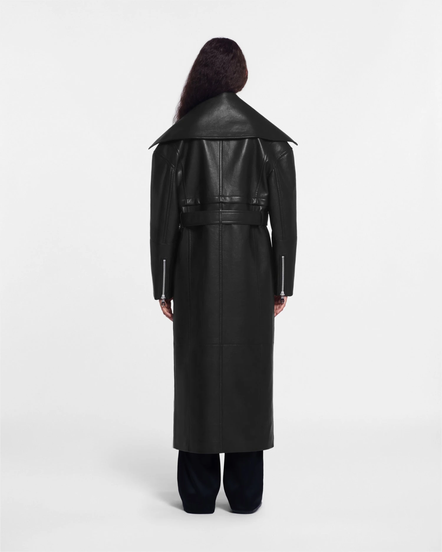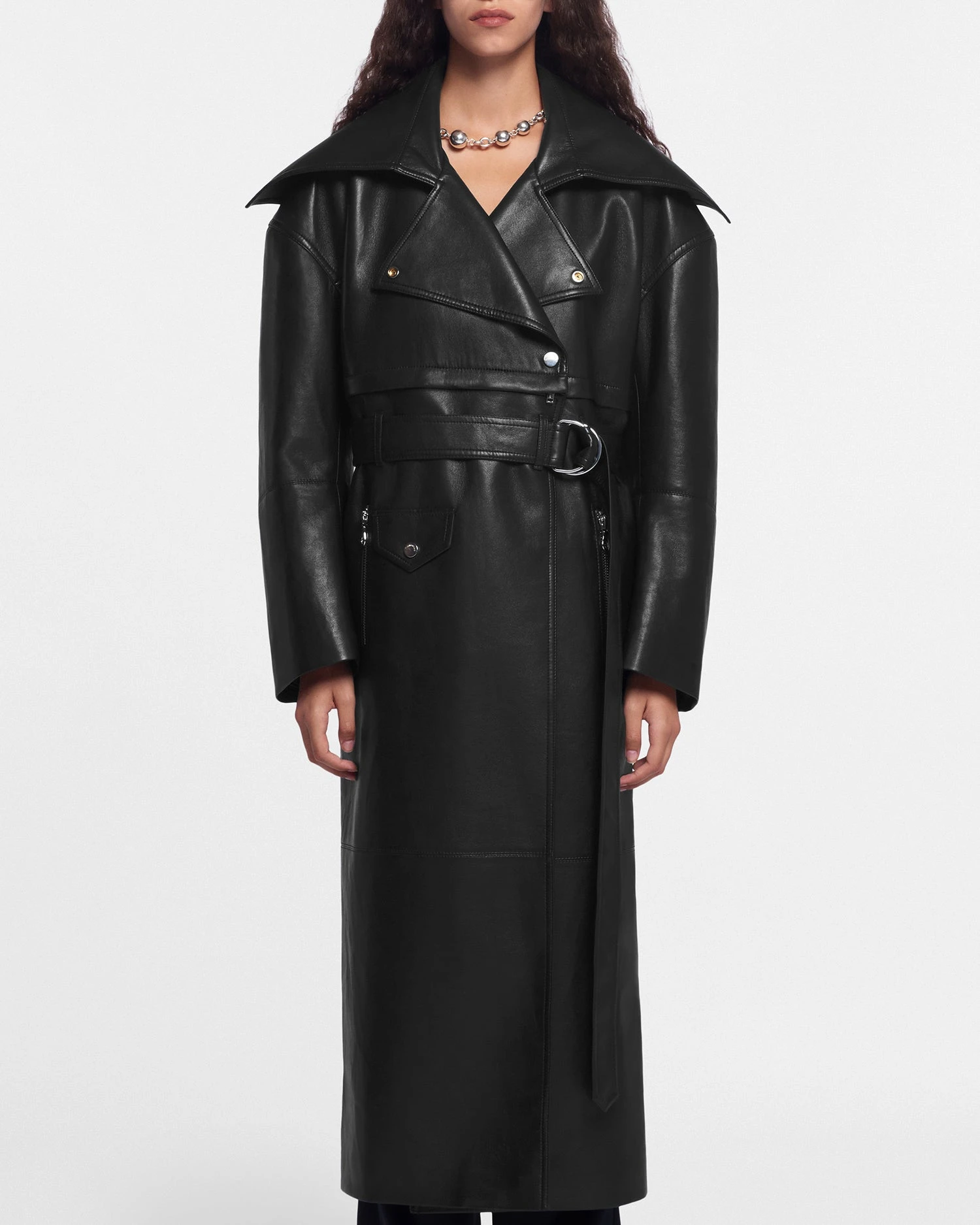 Innovative craft, new heritage and a bohemian spirit are our core design principles. A hybrid of classic trench and biker styles, the Mariella coat is crafted from regenerated leather. It is further distinguished by an exaggerated shawl collar, wide cuffs and a belt at the waist. Zip to transform into a cropped jacket or a leather skirt.