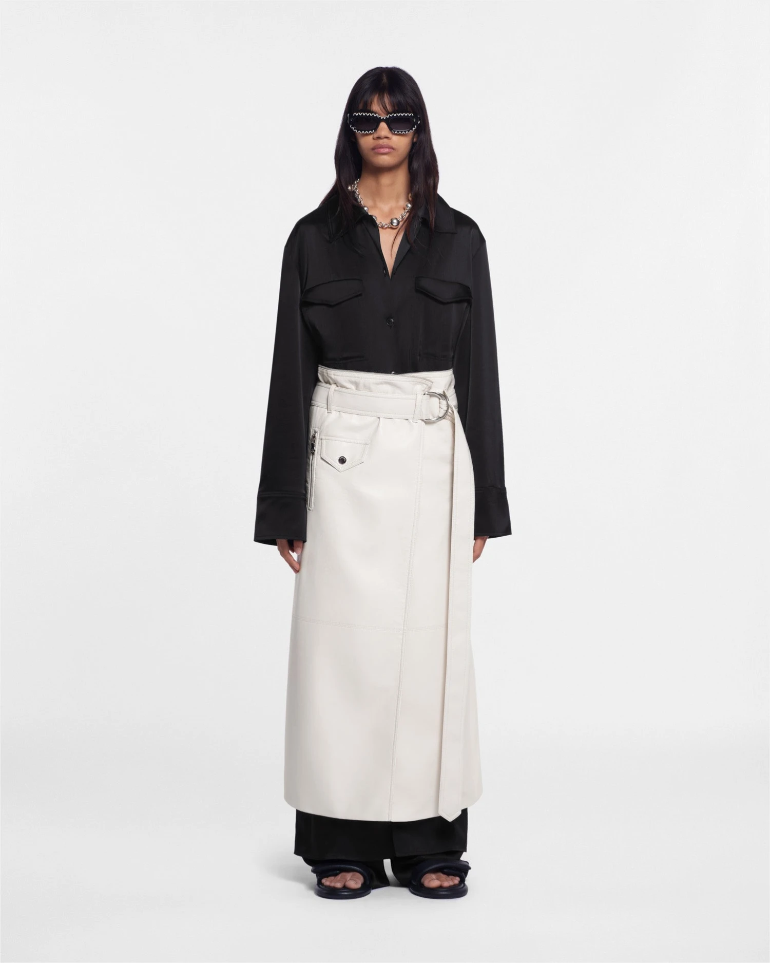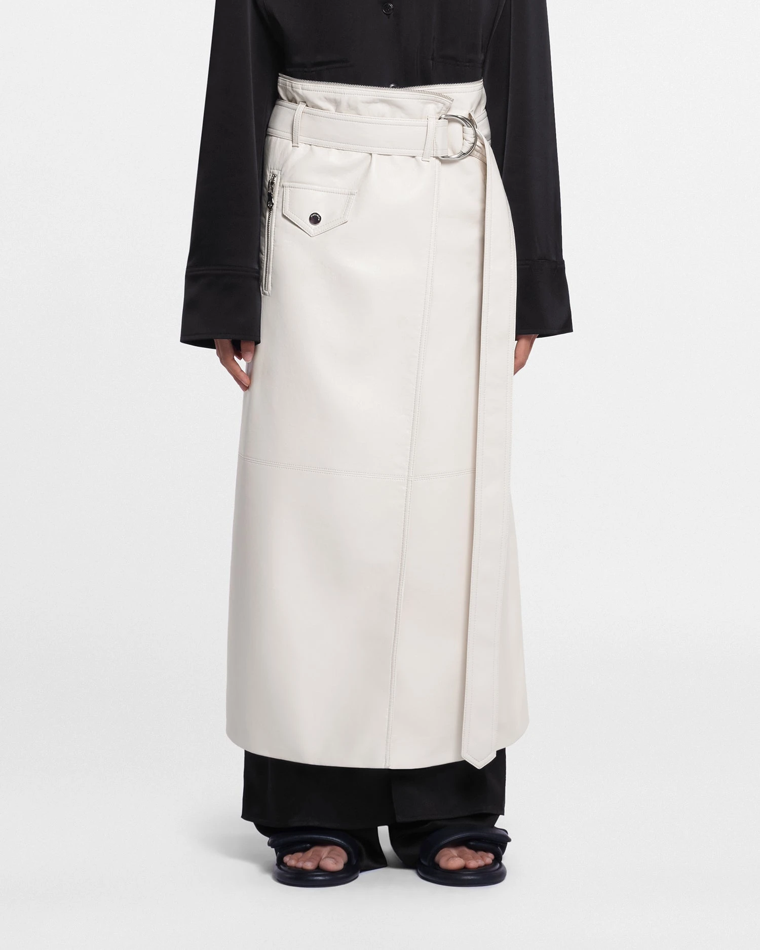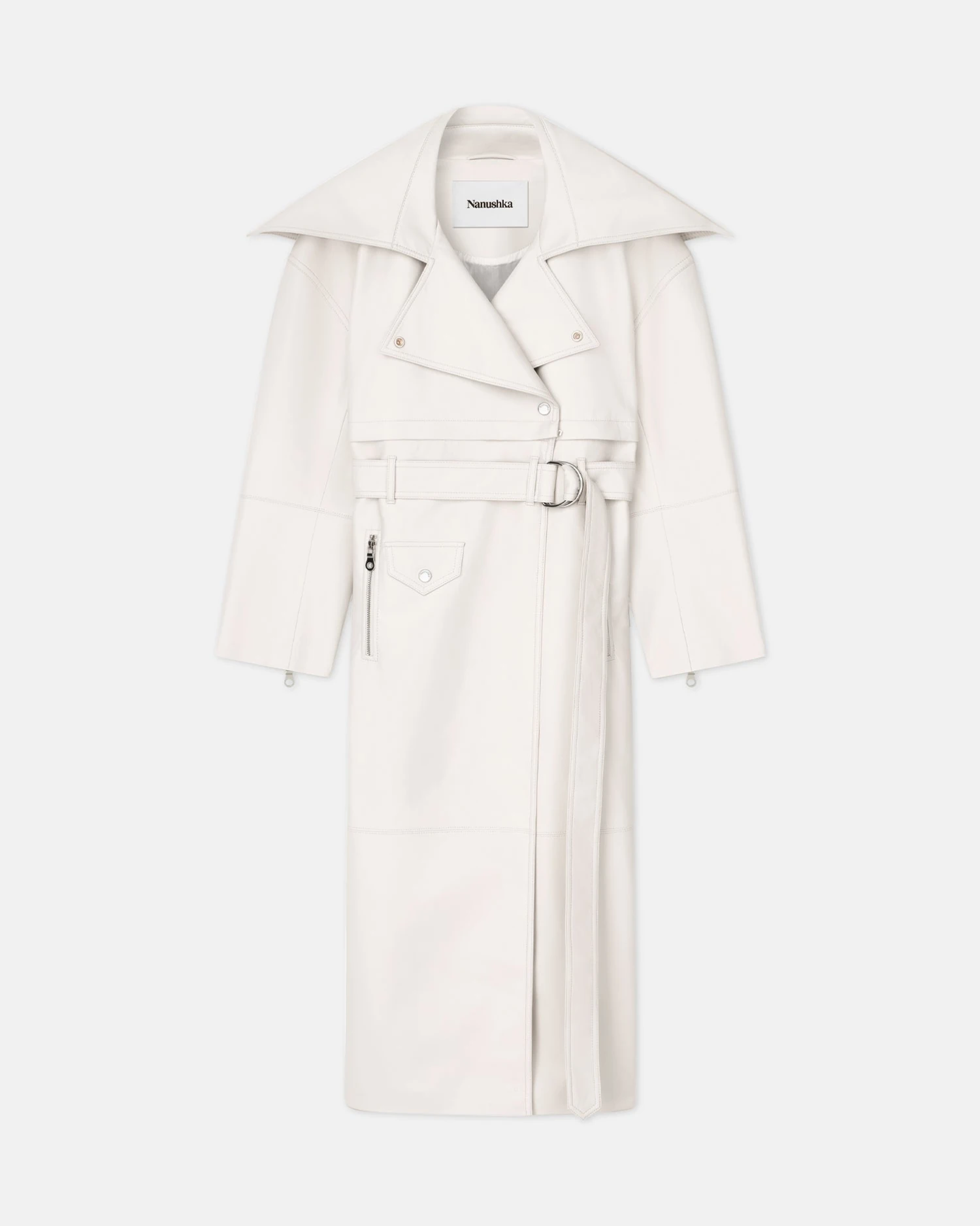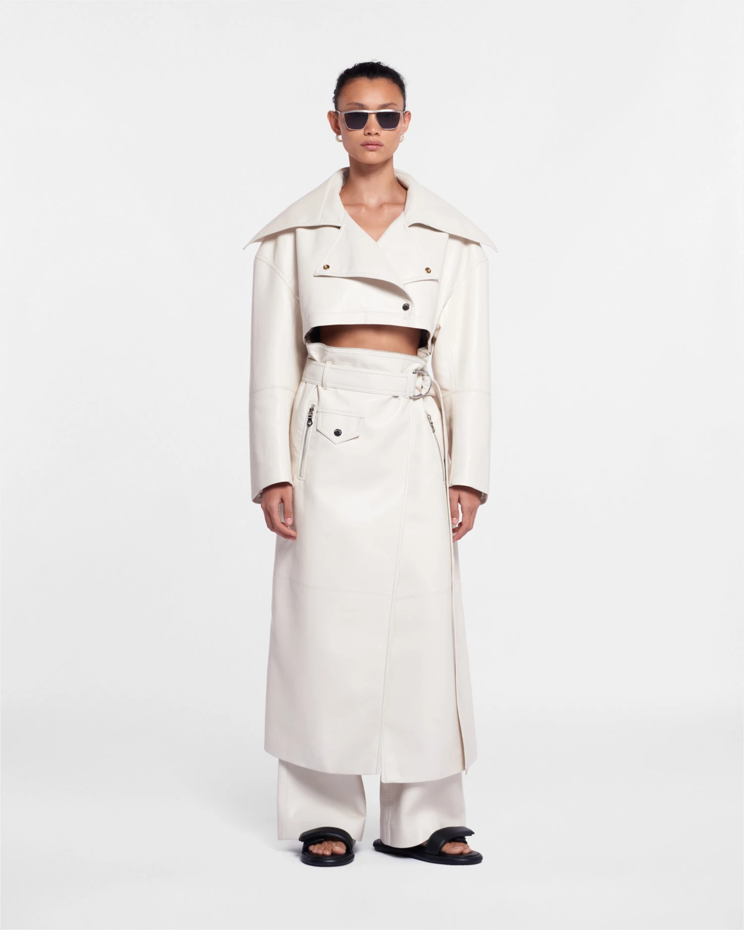 Innovative craft, new heritage and a bohemian spirit are our core design principles. A hybrid of classic trench and biker styles, the Mariella coat is crafted from regenerated leather. It is further distinguished by an exaggerated shawl collar, wide cuffs and a belt at the waist. Zip to transform into a cropped jacket or a leather skirt.