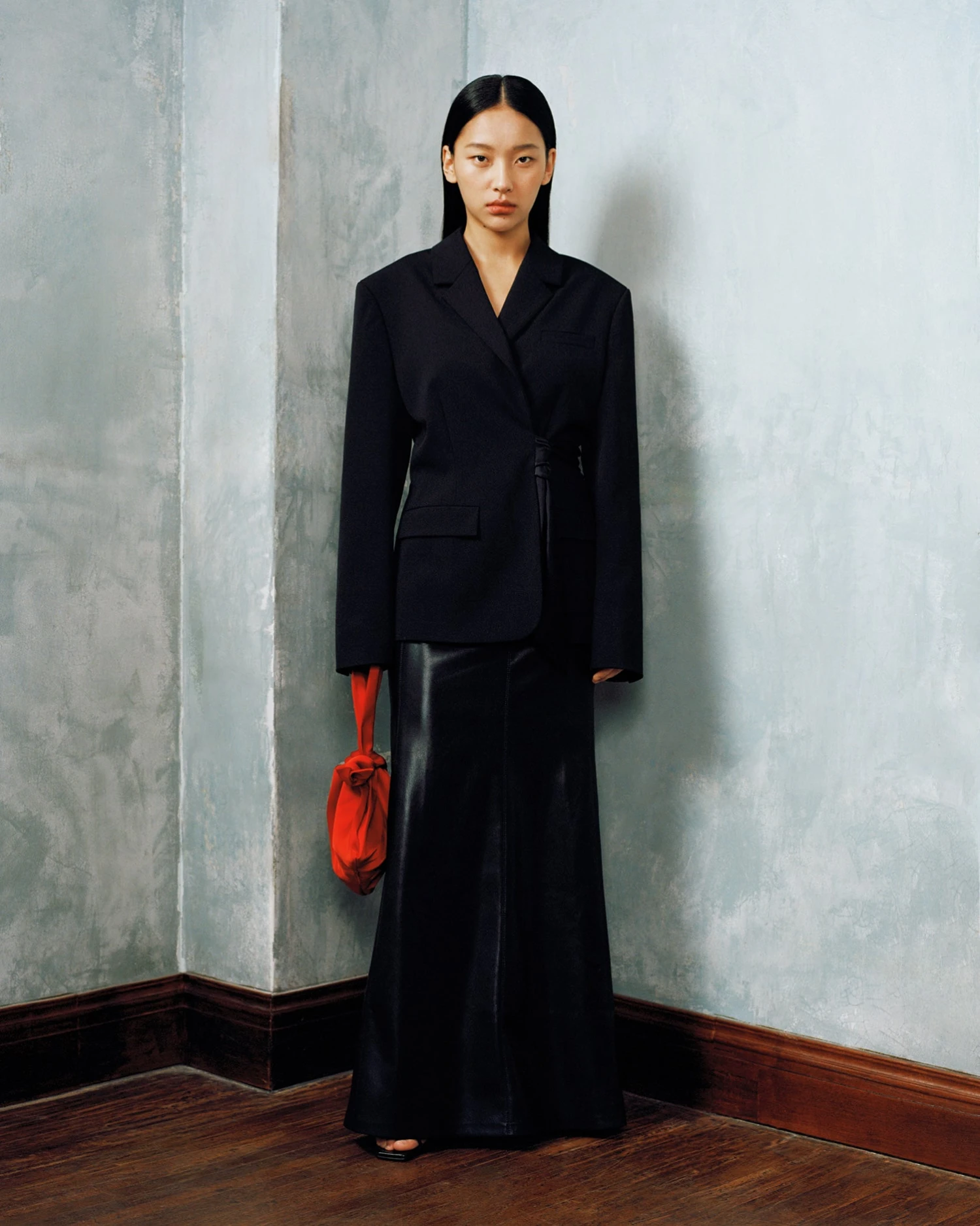 The Marline blazer showcases our intuitive juxtaposition of traditional techniques and contemporary silhouettes. Tailored from black twill, it has classic peak lapels and a welt pocket but is made modern thanks to the elegant wrap silhouette.
