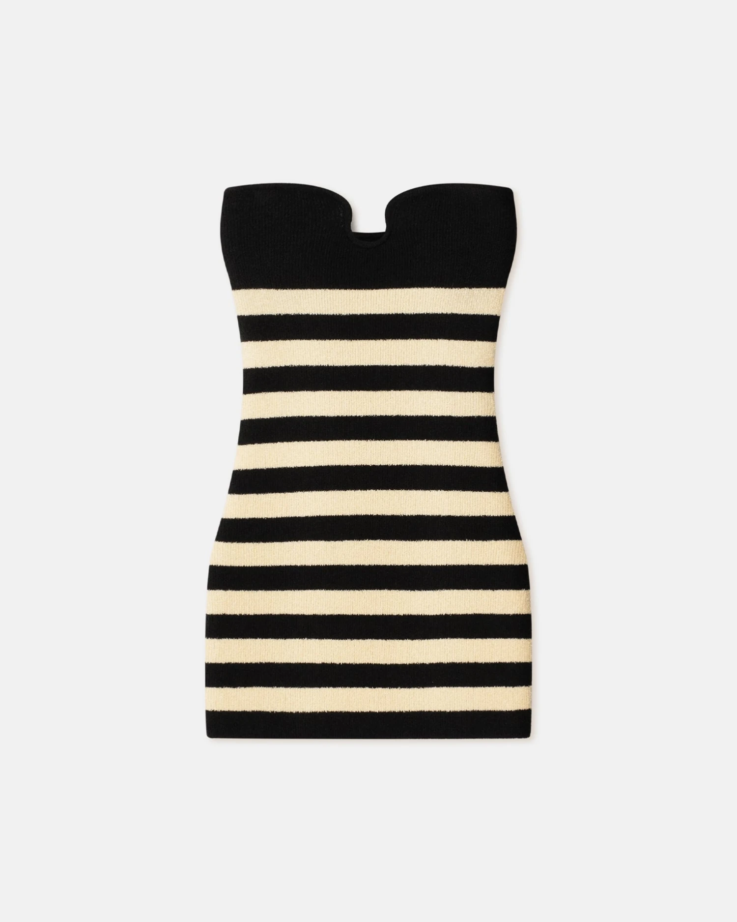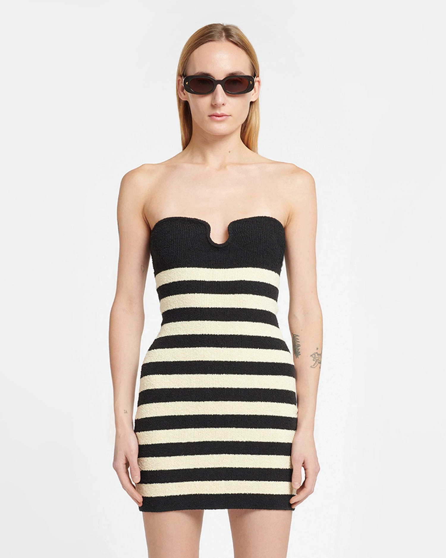 The Masato dress is knitted from soft terry decorated with creme and off-black stripes. Classic yet contemporary, it has a curved bandeau neckline.