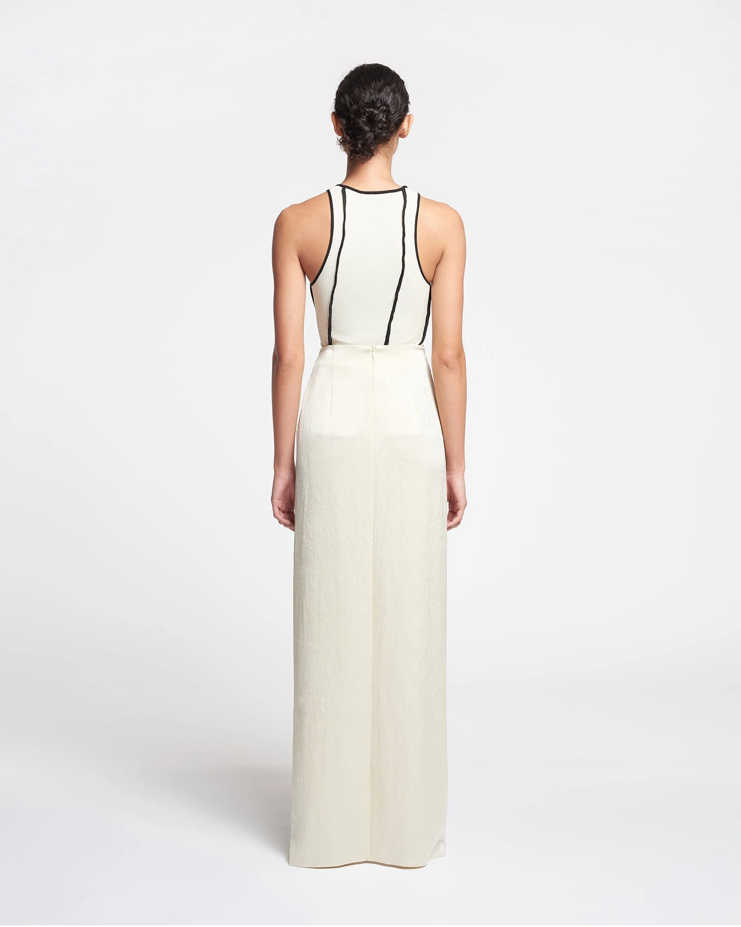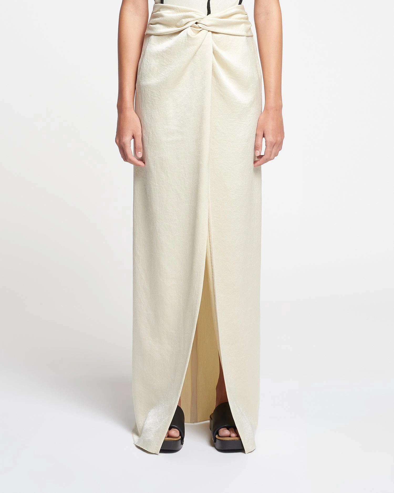 We love the beauty and ease of a draped silhouette. Made from crisp satin, the Myde skirt falls beautifully to the floor.