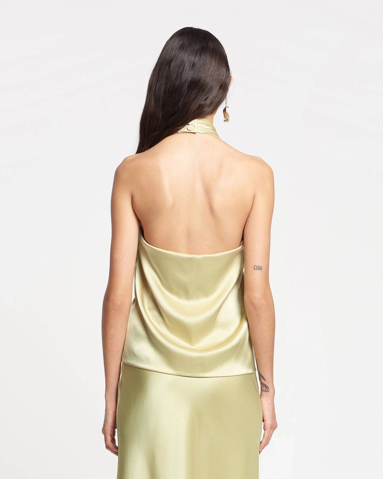 The Neline top is crafted from our lustrous slip satin in a bright lime-yellow tone – it pairs beautifully with the Fea skirt. It is further defined by a draped silhouette that extends from the high neck.