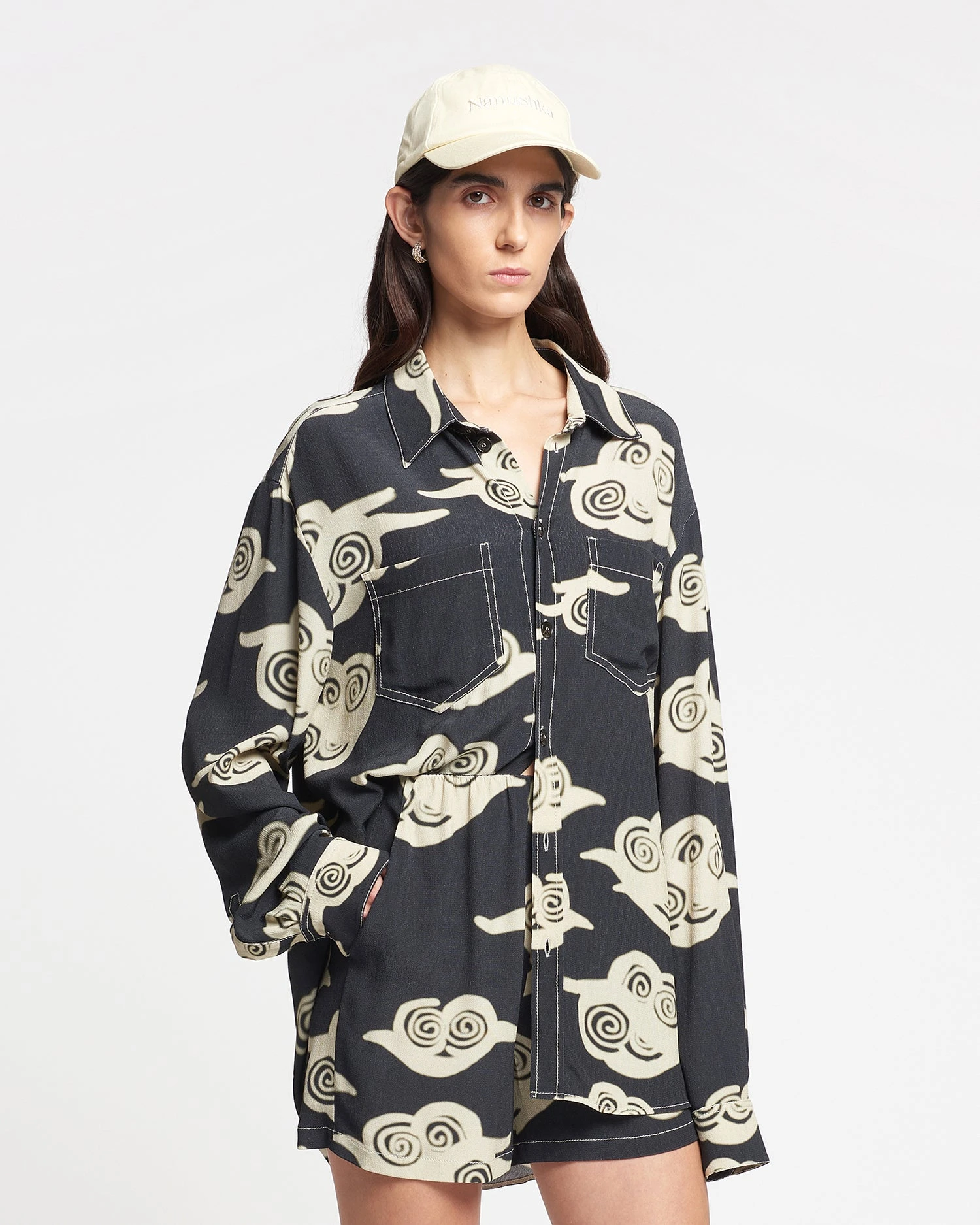 The Nerissa shirt is decorated with a creme cloud print, referencing our interest in nostalgia this season. It is made from lightweight crepe for an oversized fit and finished with a chest pocket.