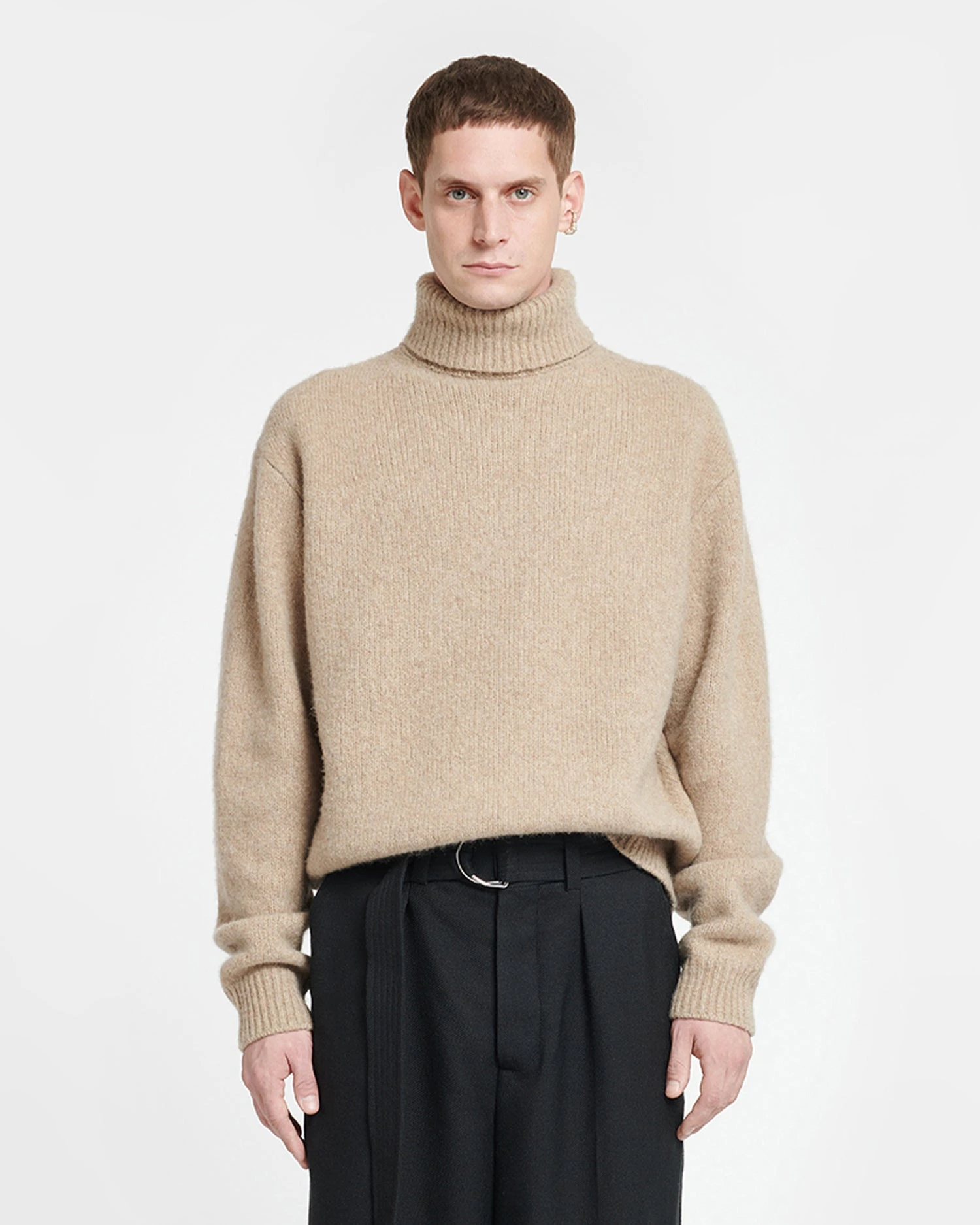 The Nevin sweater showcases our exploration of wardrobe cornerstones. A turtleneck sweater in a classic oatmeal hue, it feels modern thanks to the distressed trims. It is knitted from brushed merino for added softness.