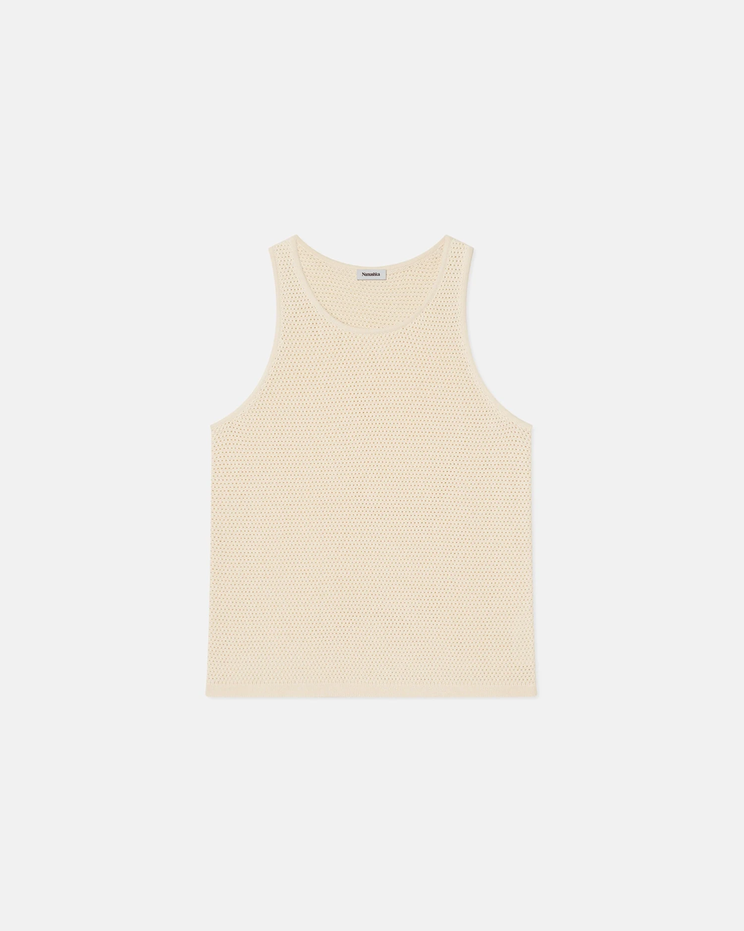 The Nyam tank top is crochet-knitted for a loose, lightweight feel. In a classic creme tone, it is designed to coordinate with the Jael shorts to complete an elegant everyday set.