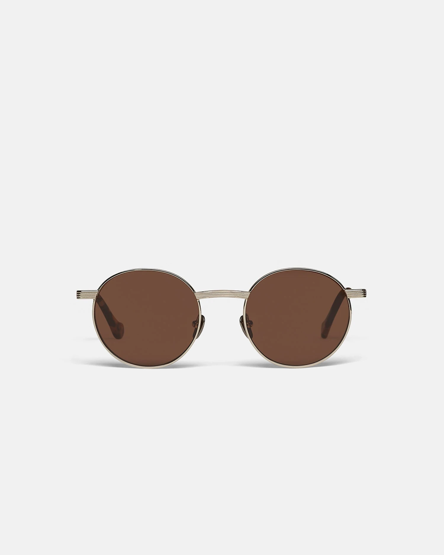 The Pola sunglasses are reminiscent of styles worn in the ā70s. They have been made from gold-tone stainless steel and have oversized round frames balanced by thin arms. They come housed in a signature alt-leather pouch upcycled from offcuts.