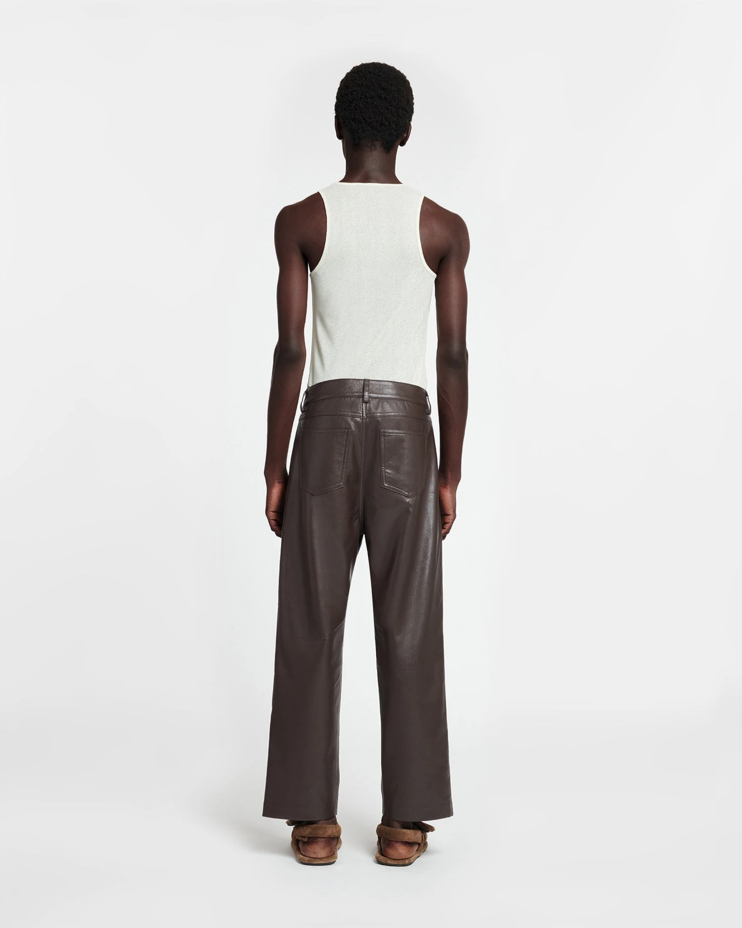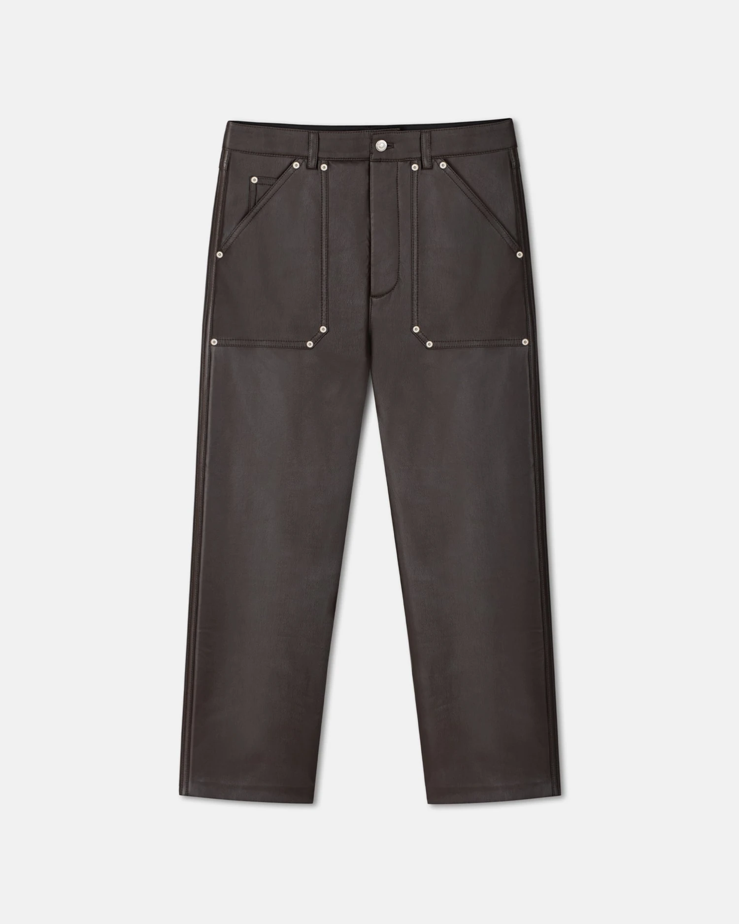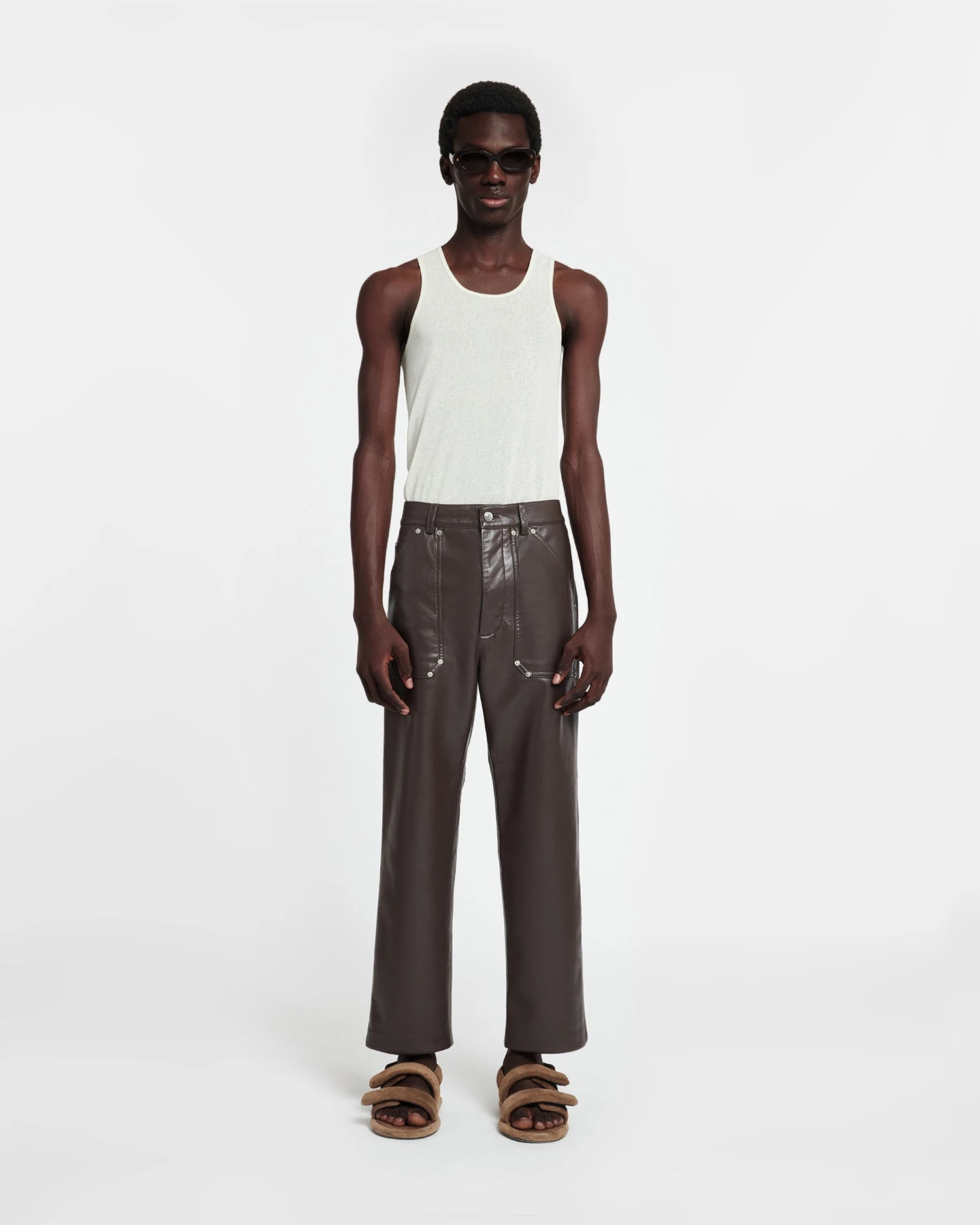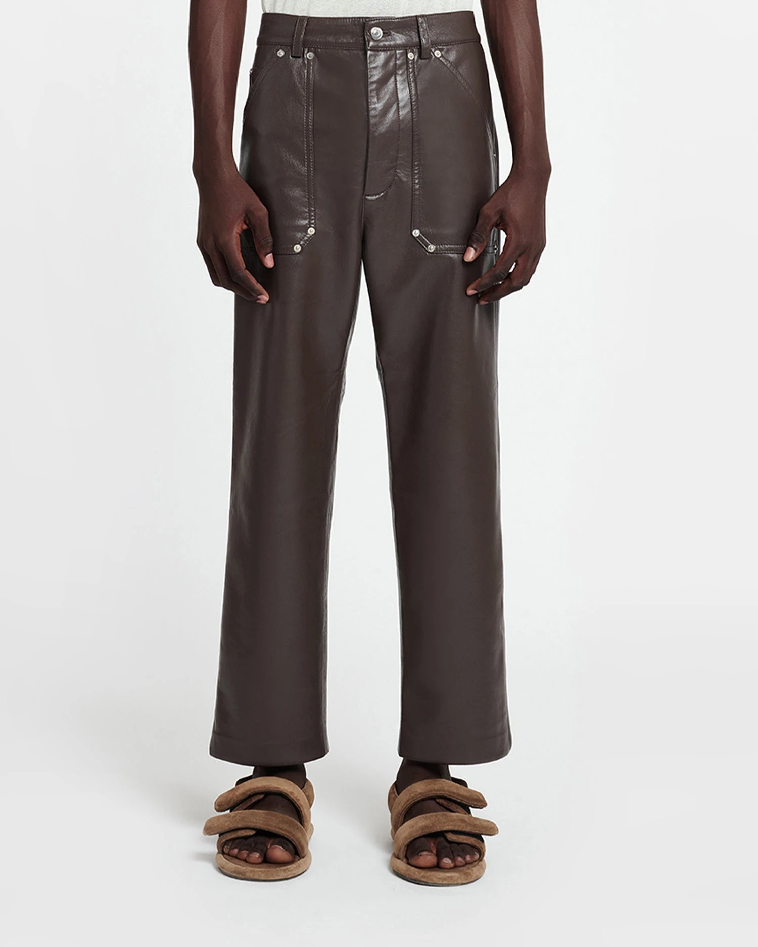 Detailed with extra rivets that outline the capacious front pockets, the Quido pants offer a modern interpretation of workwear heritage styles, They are crafted from regenerated leather for a soft yet structured feel, and fall in slim, straight legs.