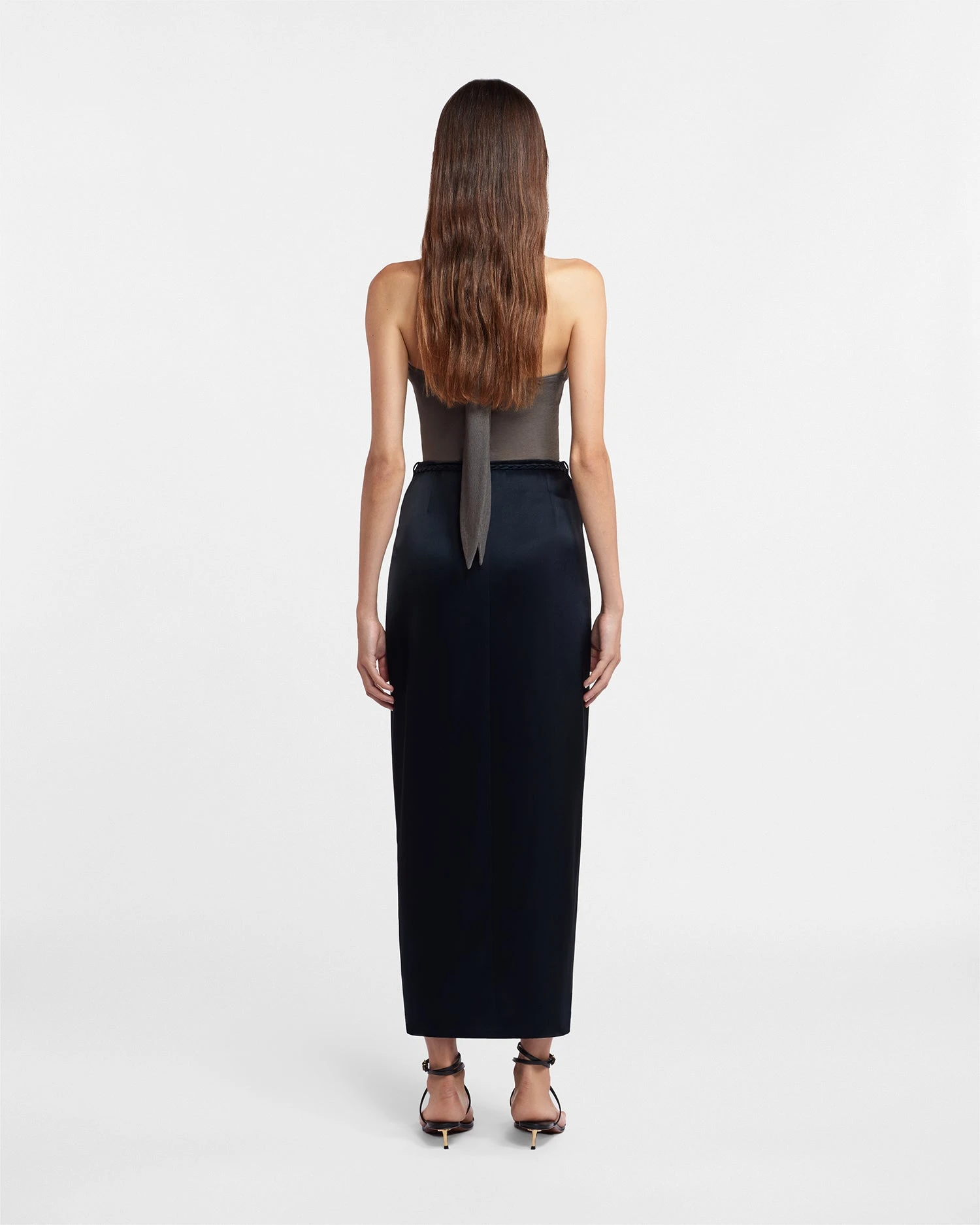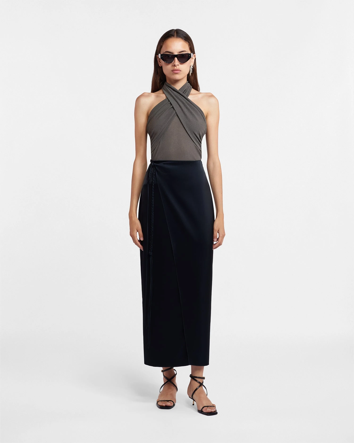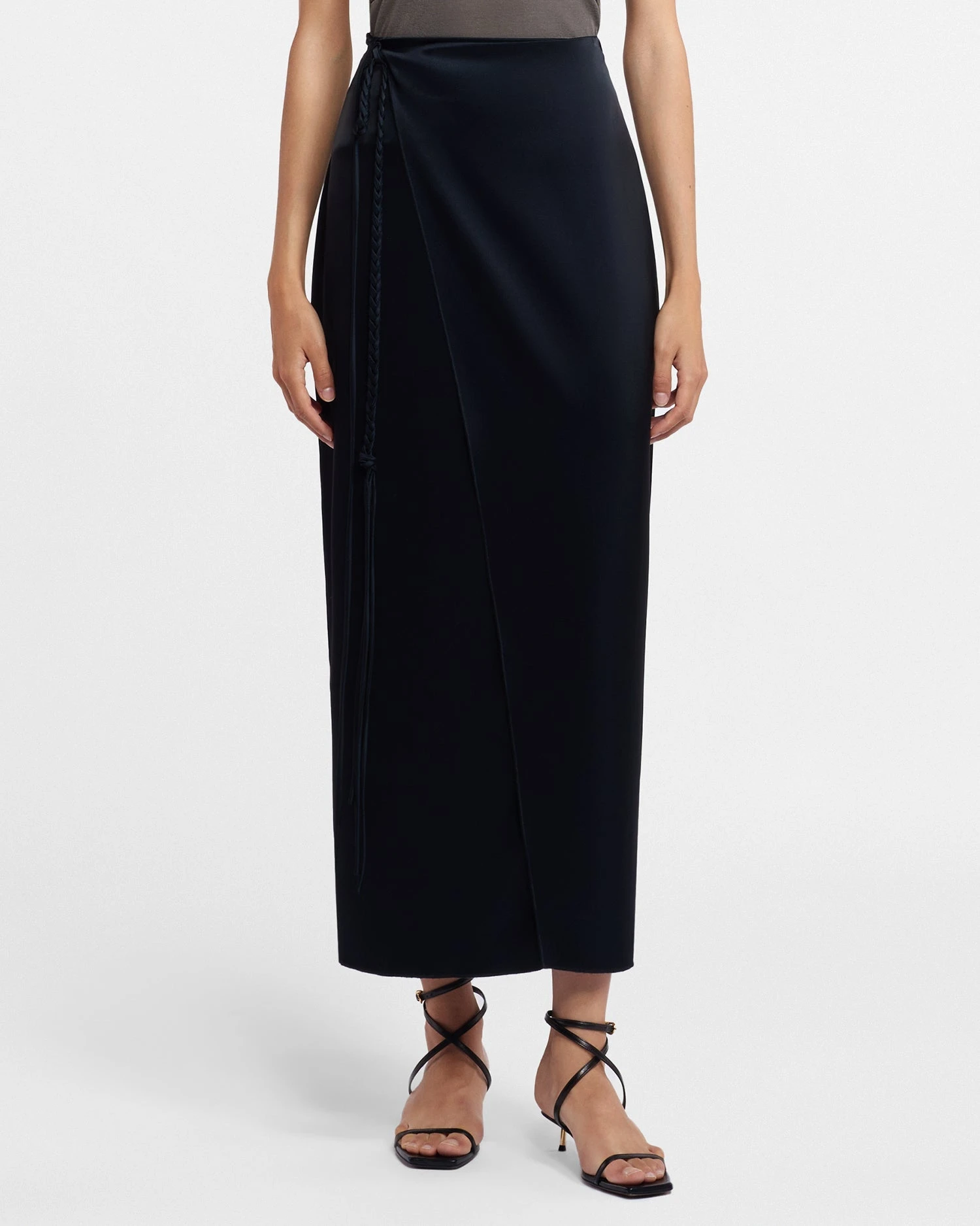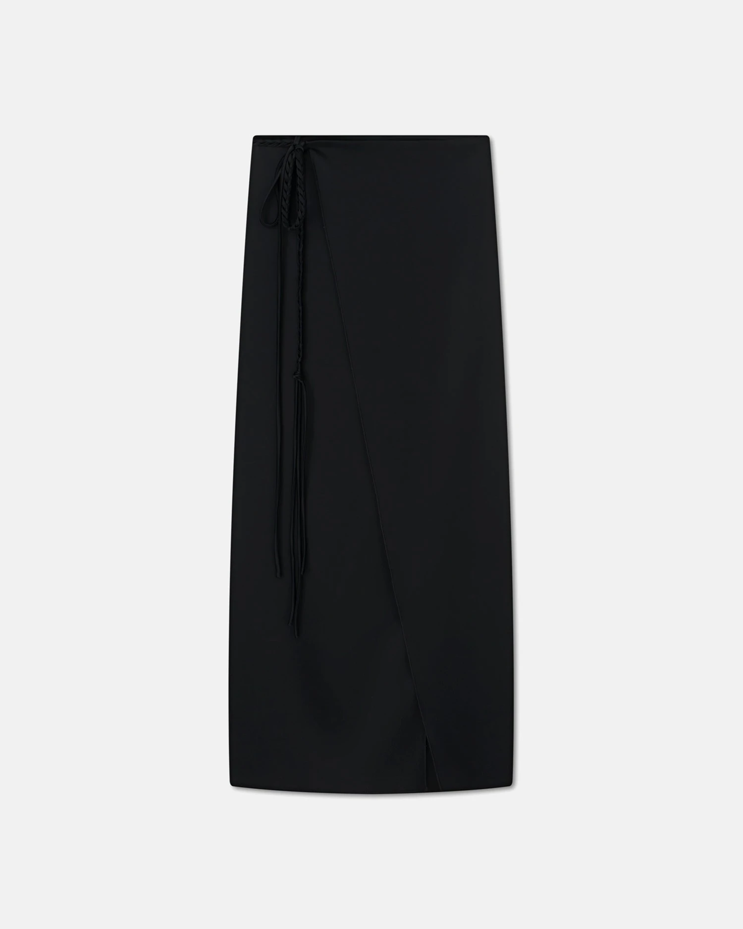 Inspired by classic slip styles, the Racha skirt has a beautiful, fluid shape. Made from glossy black slip satin, it’s had a cross-over front thatās secured with ties at the side.