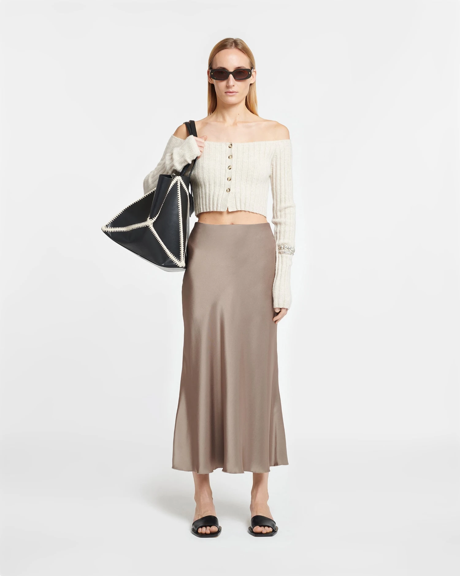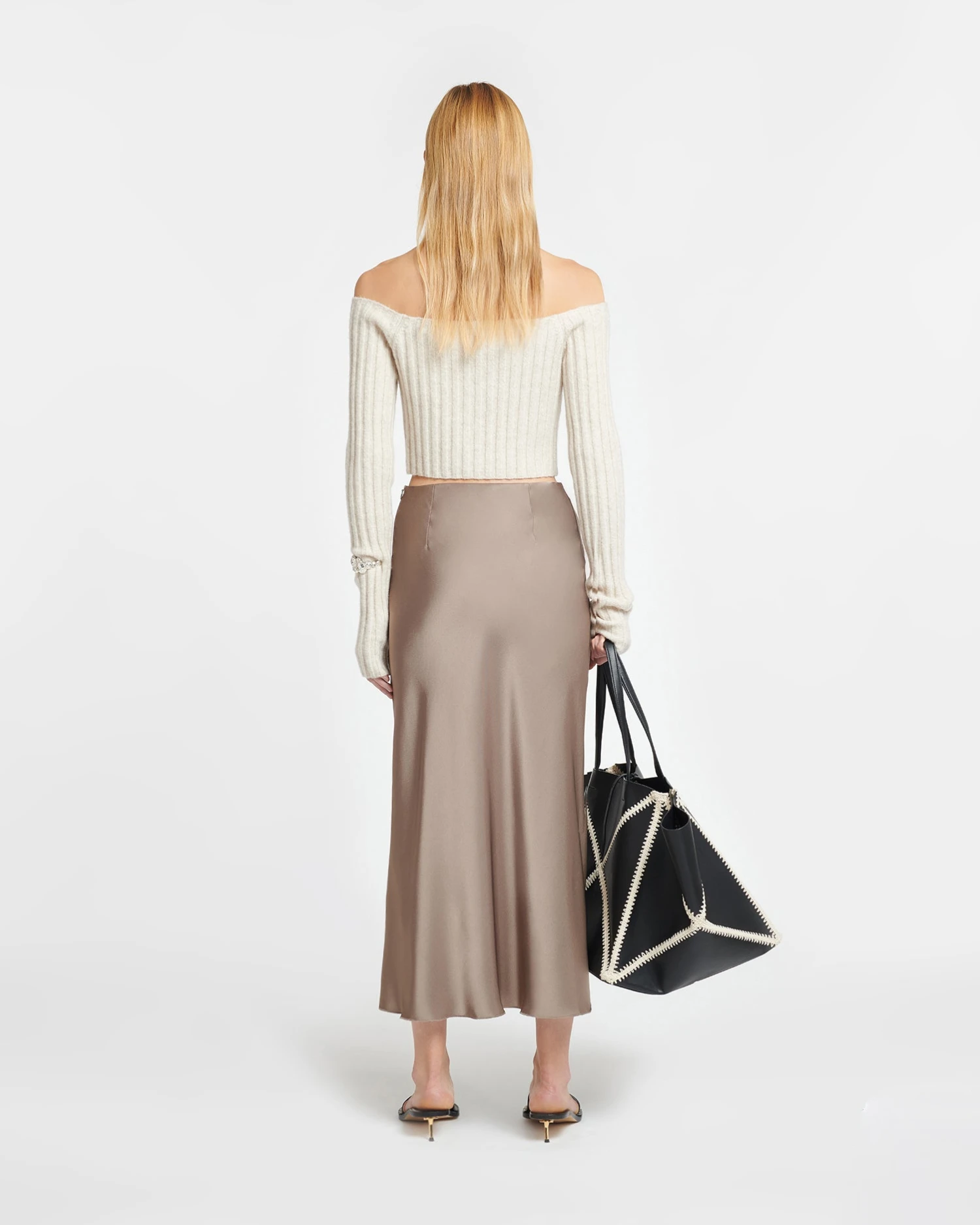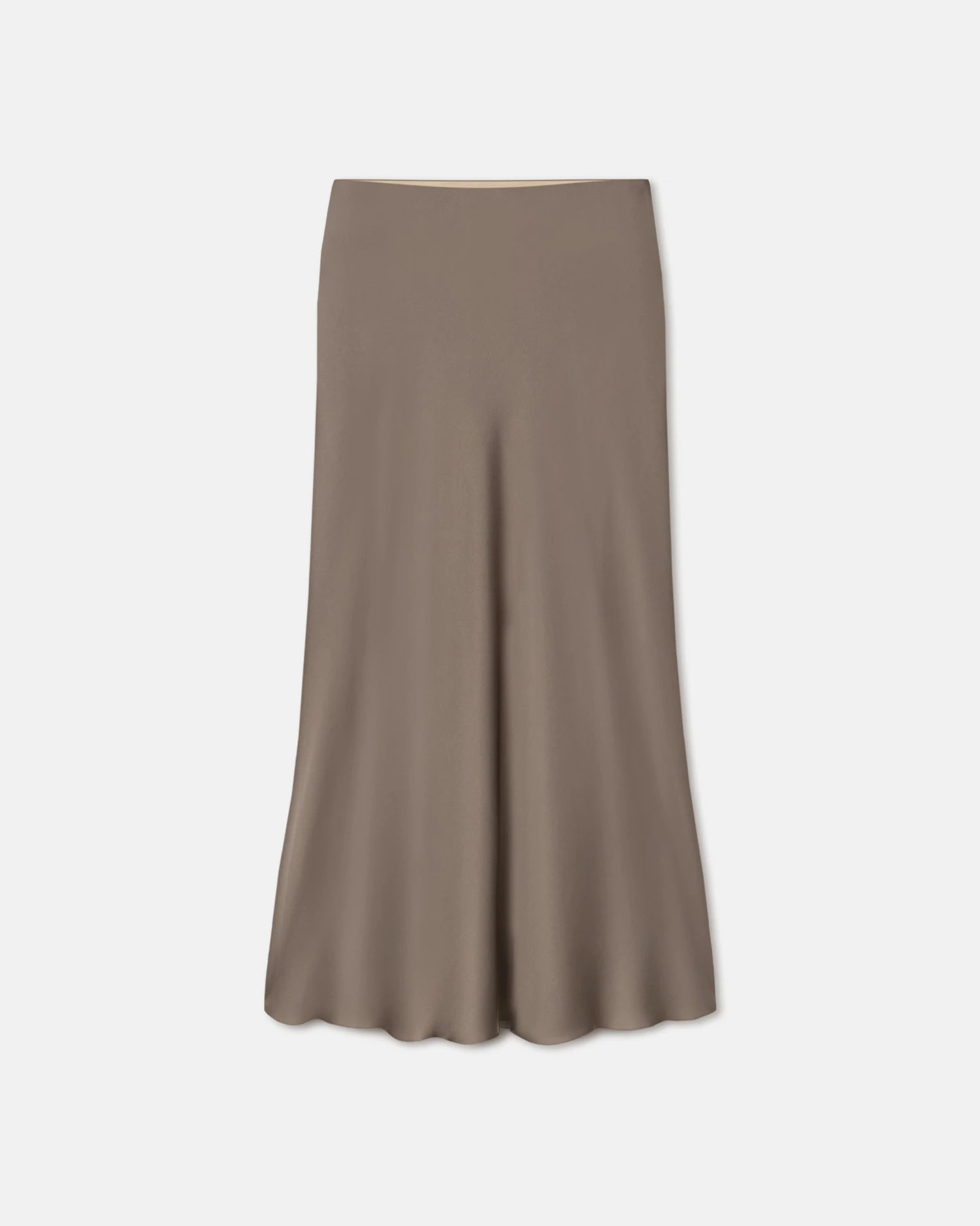 Inspired by classic slip styles, the Razi skirt has a clean-lined, fluid shape. Made from lustrous clay-coloured slip satin, it sits high on the waist falling to mid-calf.