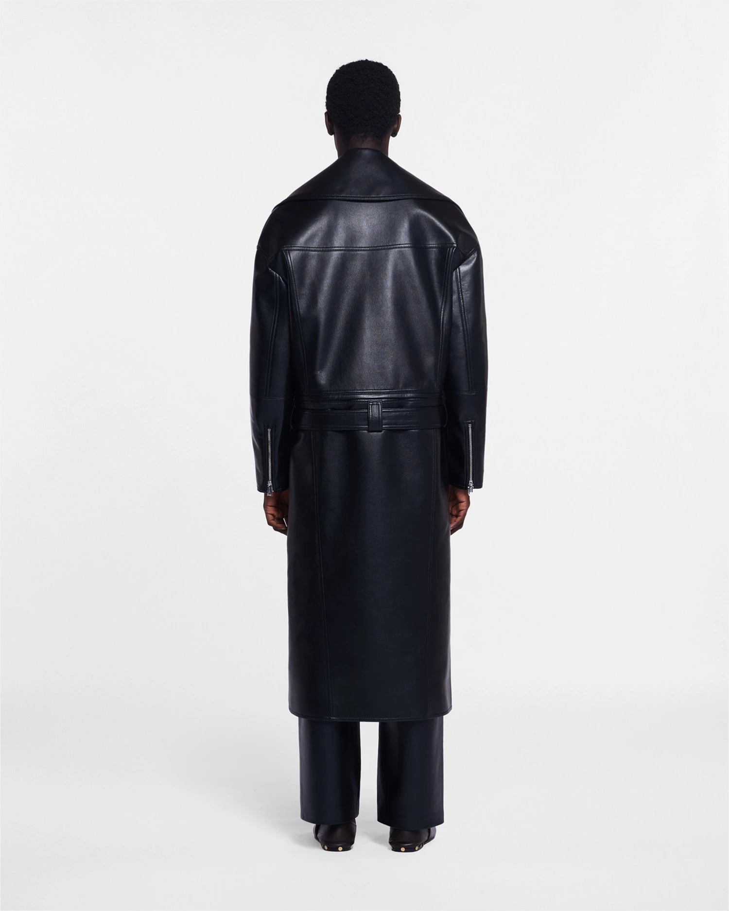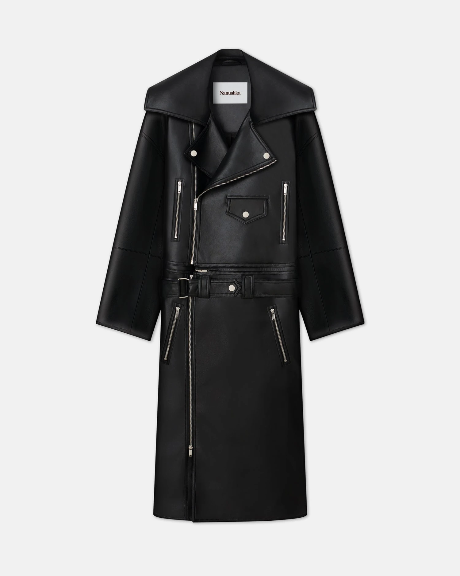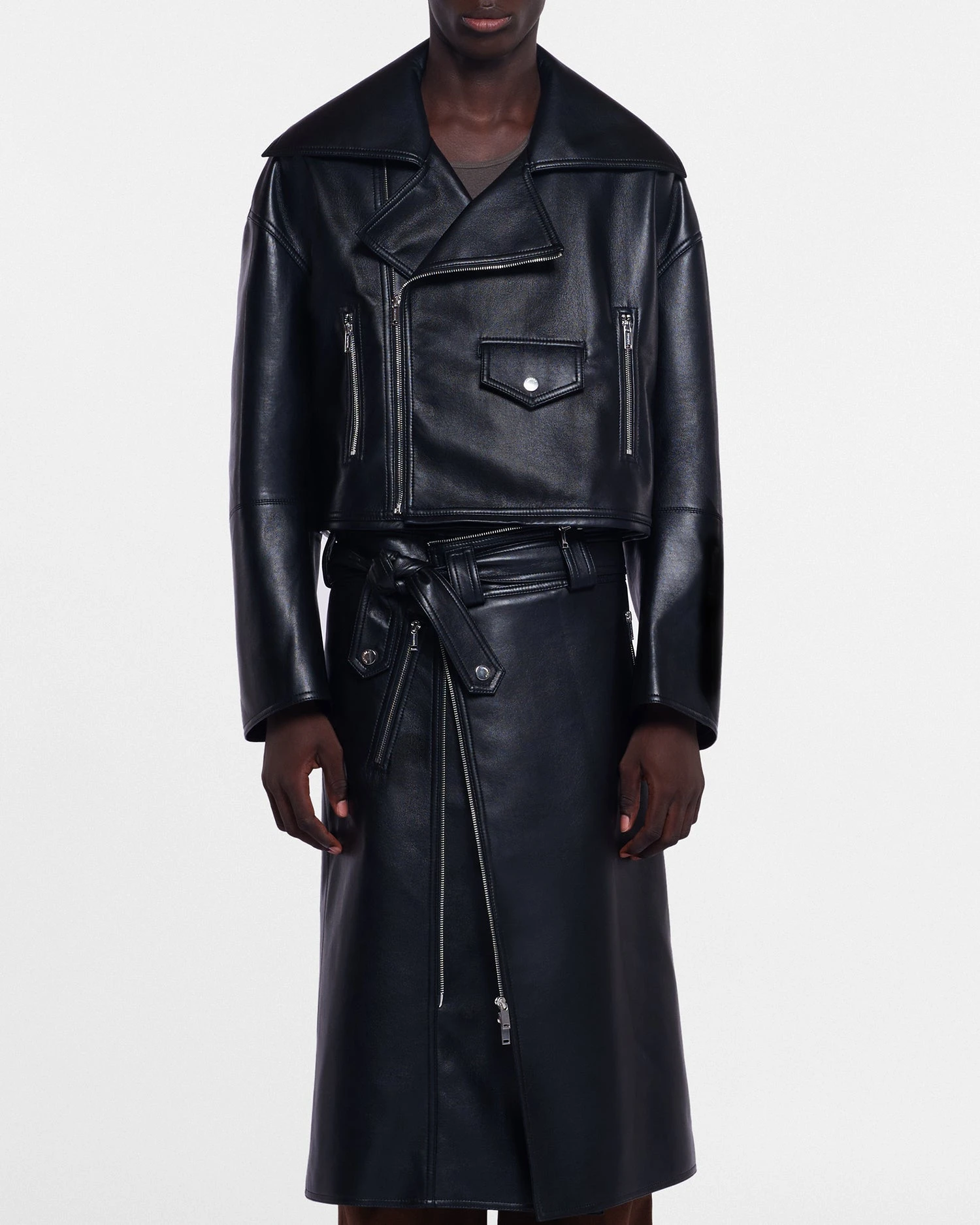 Innovative craft, new heritage and a bohemian spirit are our core design principles. The Ross coat has a modern biker silhouette crafted from regenerated leather. It is further distinguished by an exaggerated shawl collar, wide cuffs and a snap-fastening tab at the waist. Zips allow the coat to transform into seperates for easy styling.