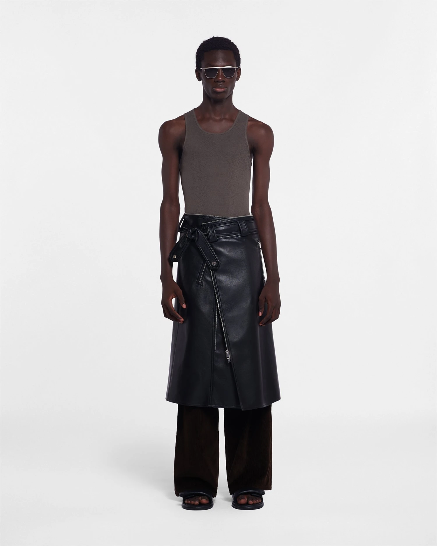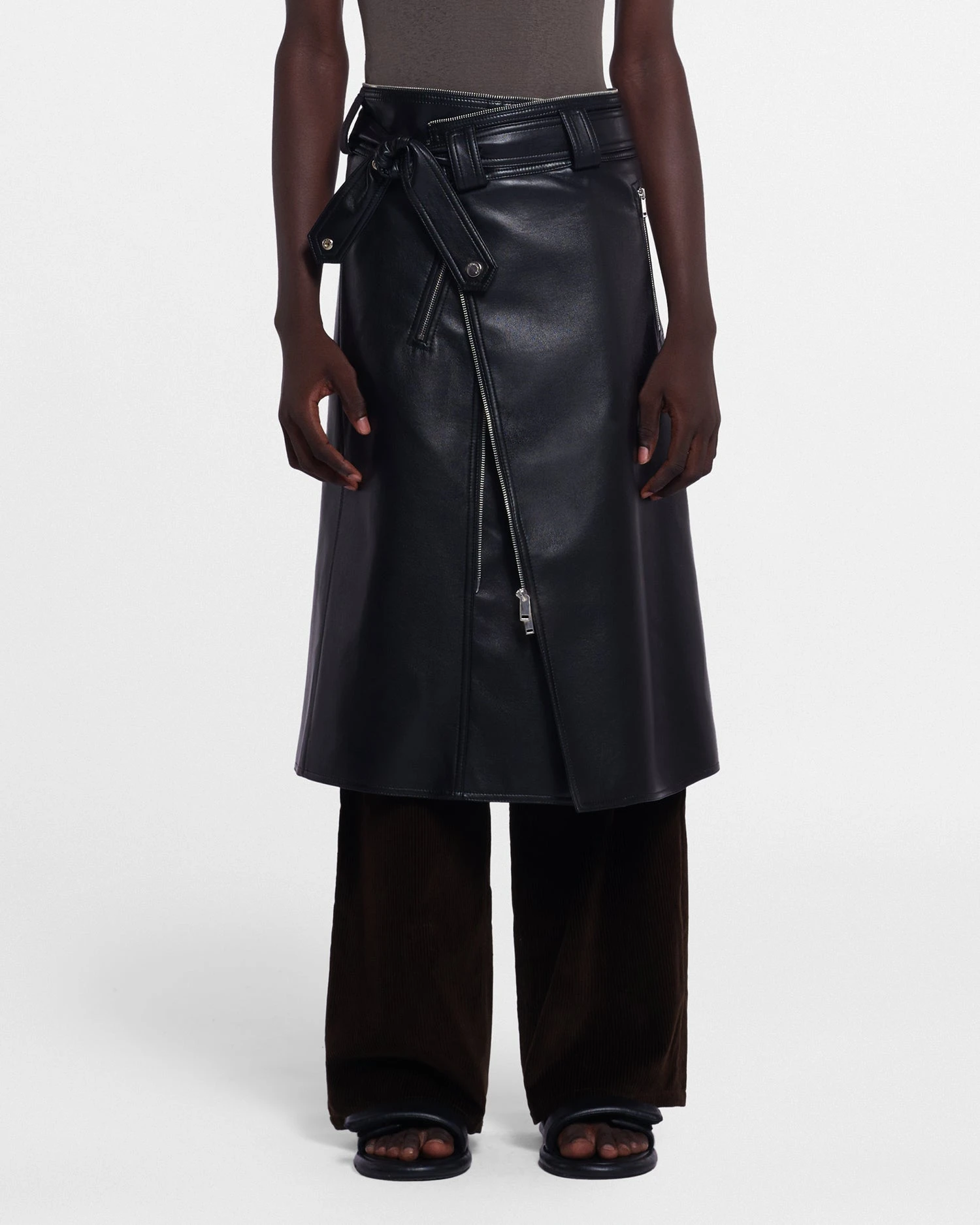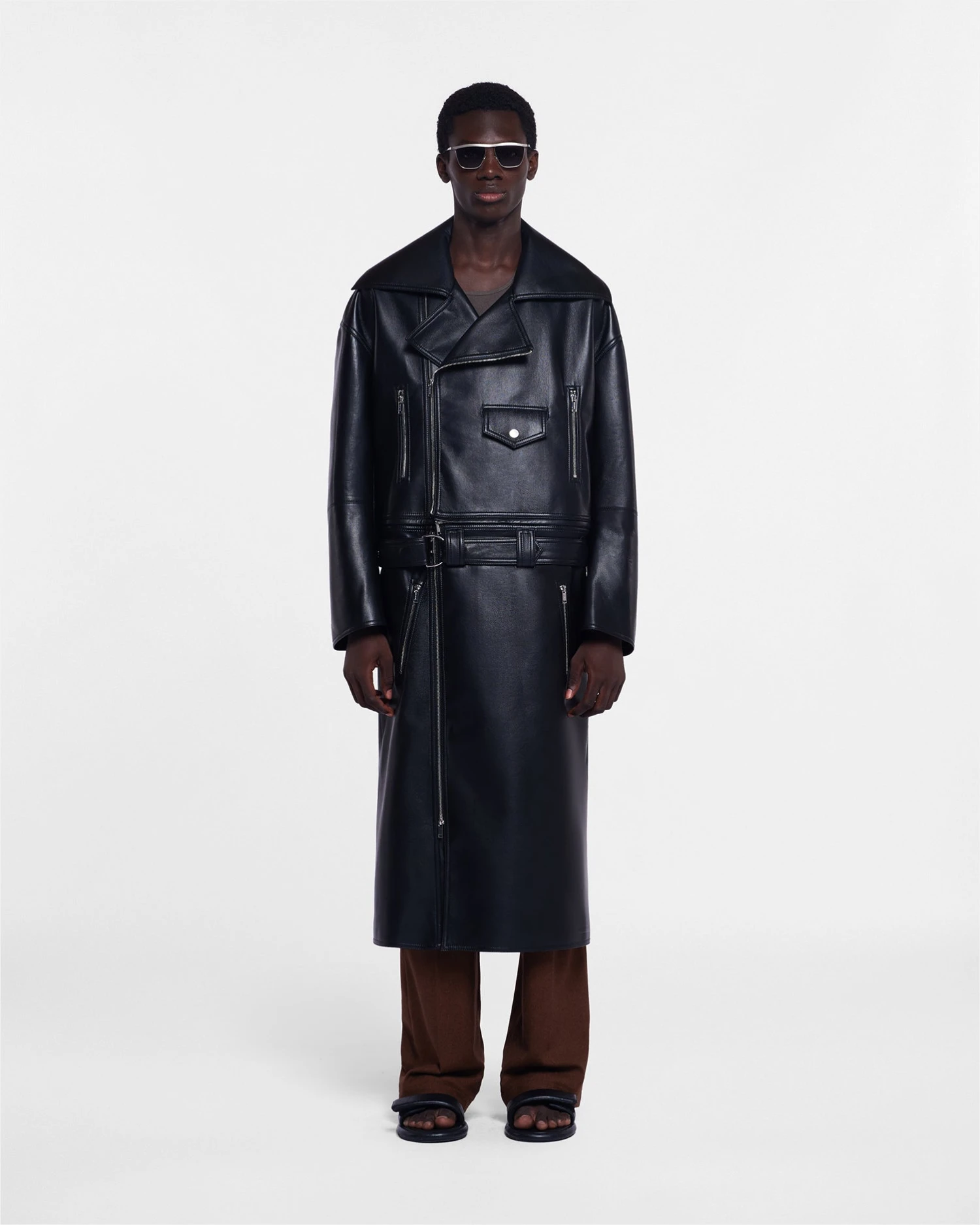 Innovative craft, new heritage and a bohemian spirit are our core design principles. The Ross coat has a modern biker silhouette crafted from regenerated leather. It is further distinguished by an exaggerated shawl collar, wide cuffs and a snap-fastening tab at the waist. Zips allow the coat to transform into seperates for easy styling.