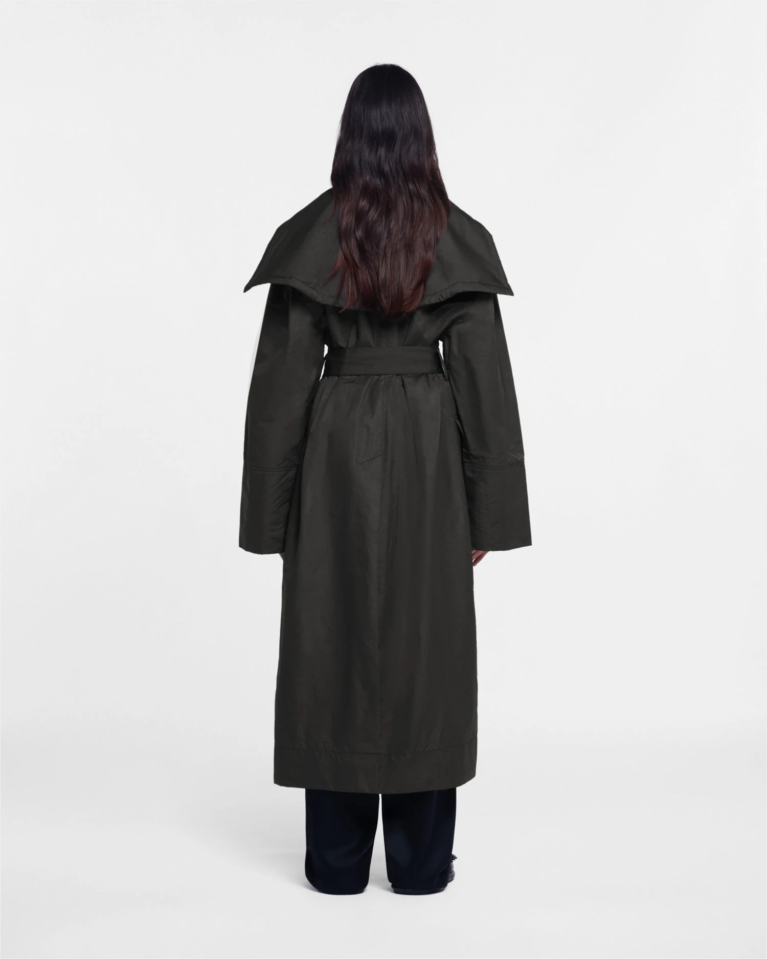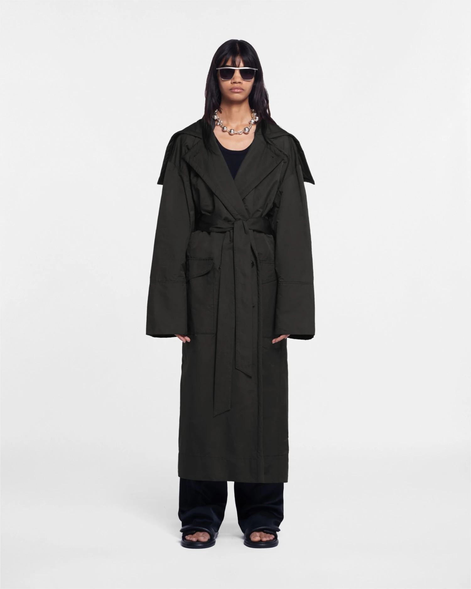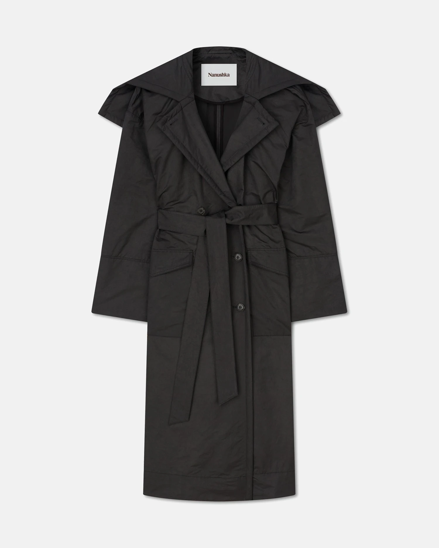 The Ruta coat demonstrates our ethos that if a garment is designed to function well, it will, by definition, be beautiful. Itās made from a tech parachute fabric thatās windproof and water-resistant, and finished with a tie-fastening belt and capacious pockets. The wide shawl collar is both functional and elegant.