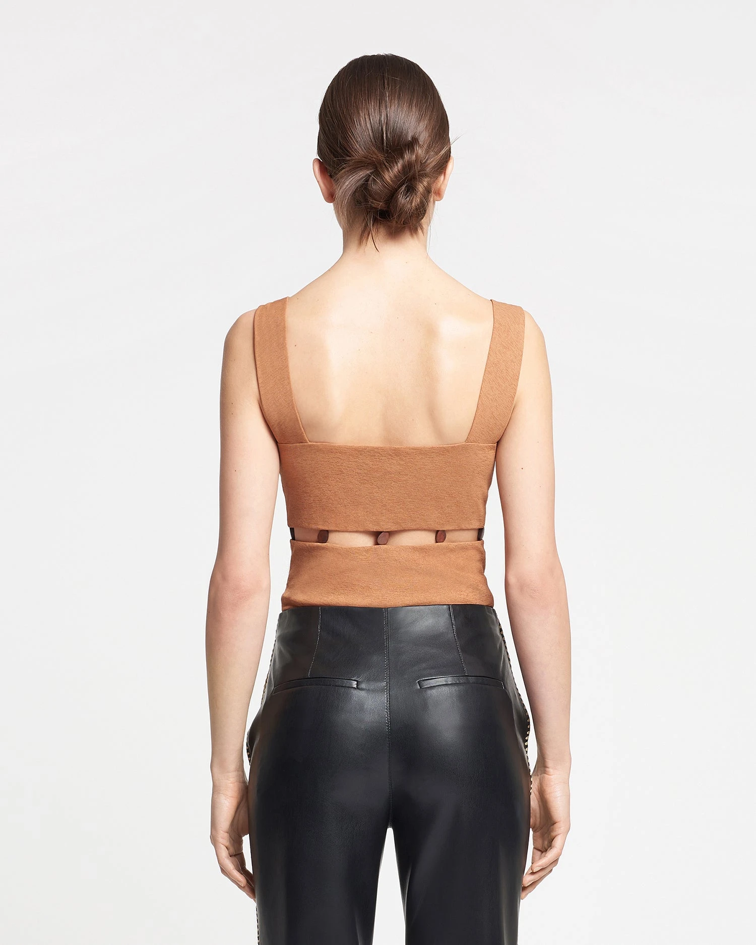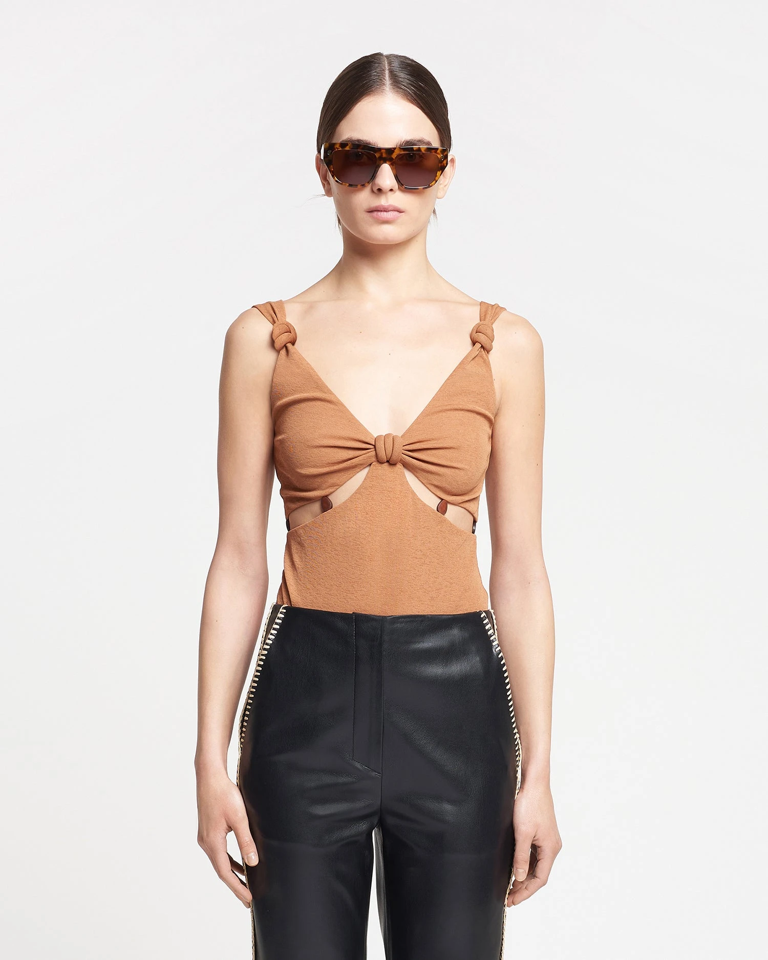 The Seve bodysuit demonstrates the process of re-rooting elements of our design history and transforming them into something new. Made from our signature mesh jersey, it is elevated through knotted shoulder details and beaded cut-outs at the waist.