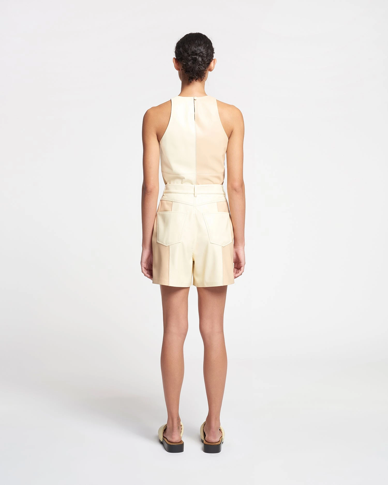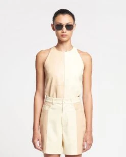 The Teza top is an effortless way to wear our signature OKOBOR™ alt-leather. Made from a patchwork of peach and vanilla, it is cut to a clean racerback tank silhouette and is finished with a simple round neck.