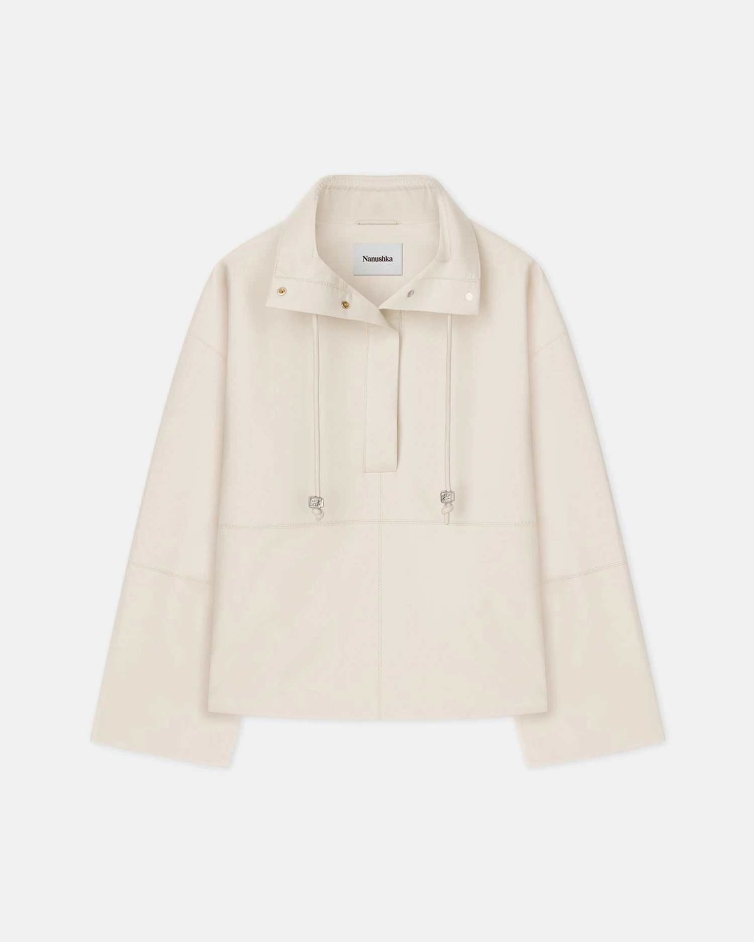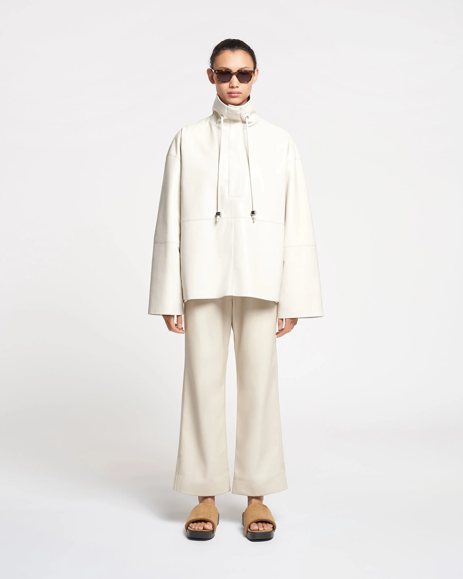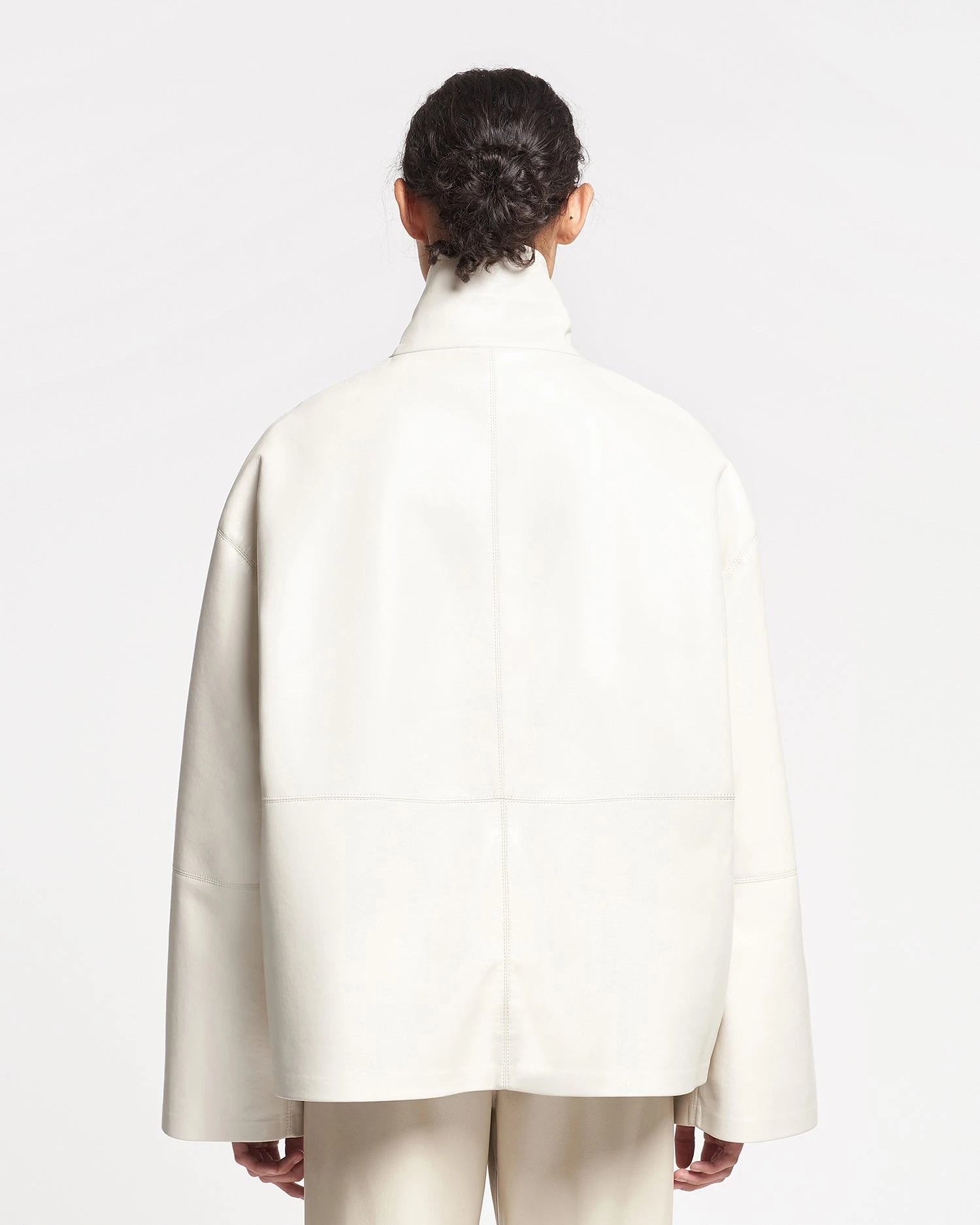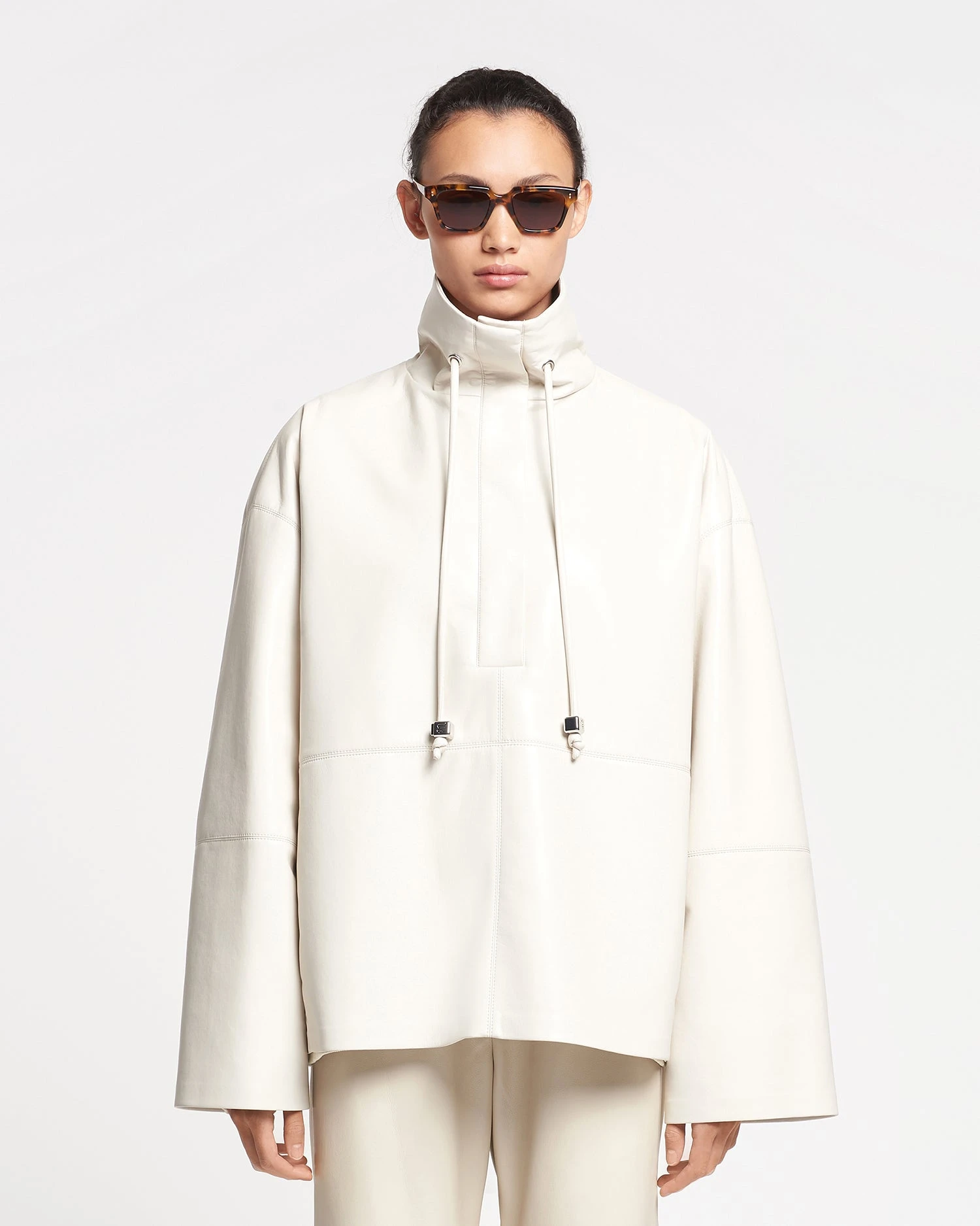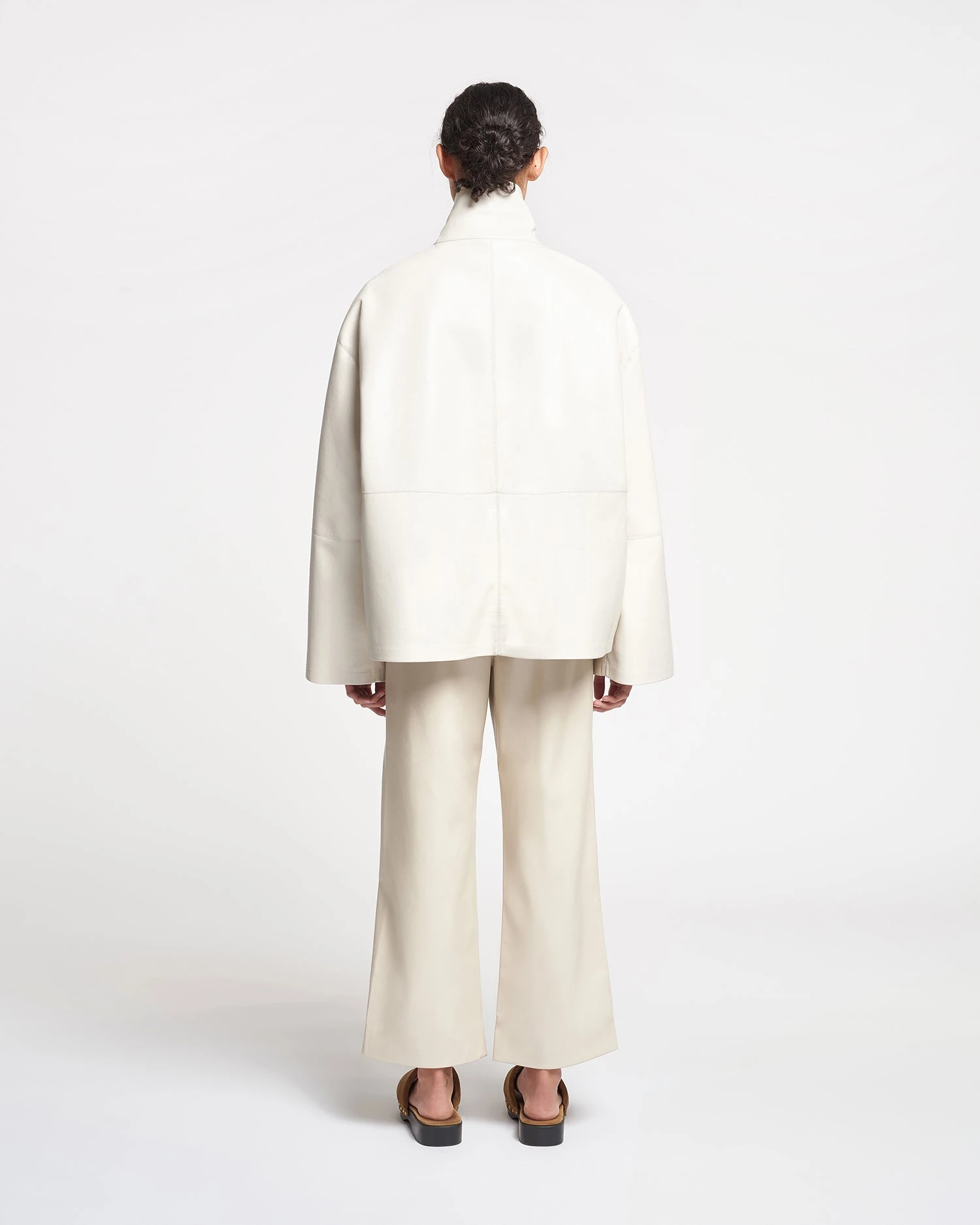 The Yvette jacket is an elevated take on a classic utilitarian style. Crafted from our butter-soft regenerated leather, it has a funnel neck silhouette that can be adjusted at the drawstring ties. The fit is easy and oversized – perfect for layering.