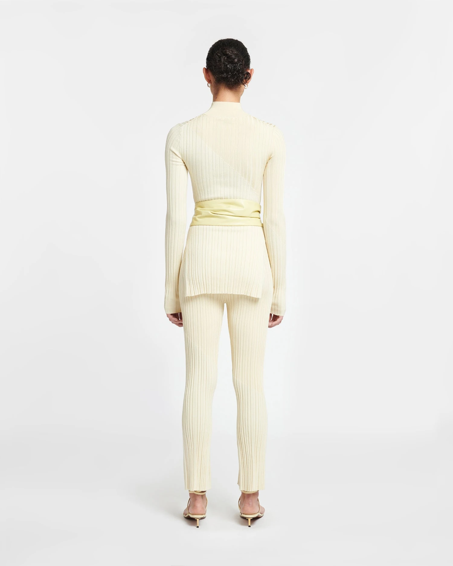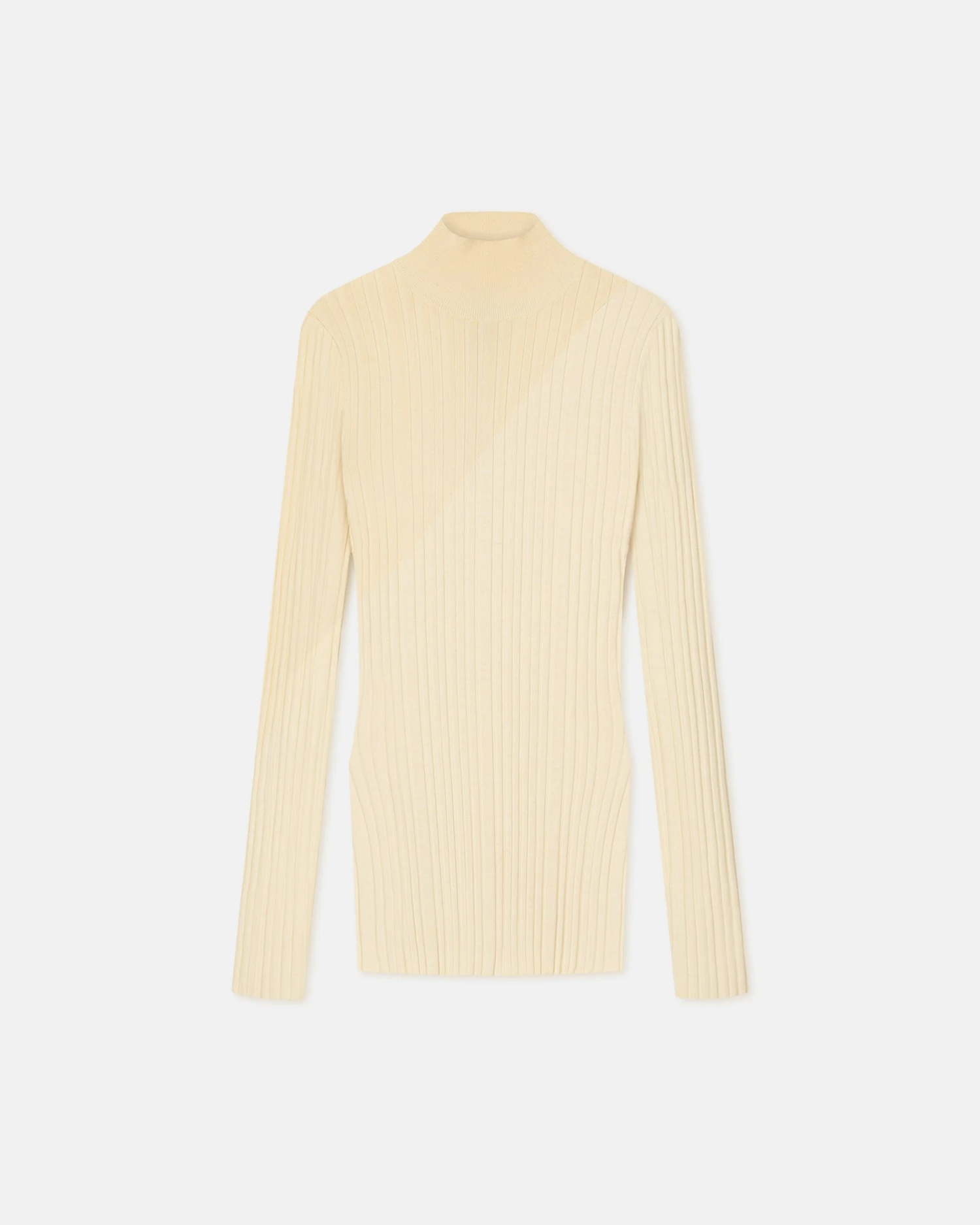 The Zareen top is rib-knitted with touches of merino wool for lightweight warmth. Side slits as well as a lime yellow and creme colour palette make the classic turtleneck silhouette feel modern.