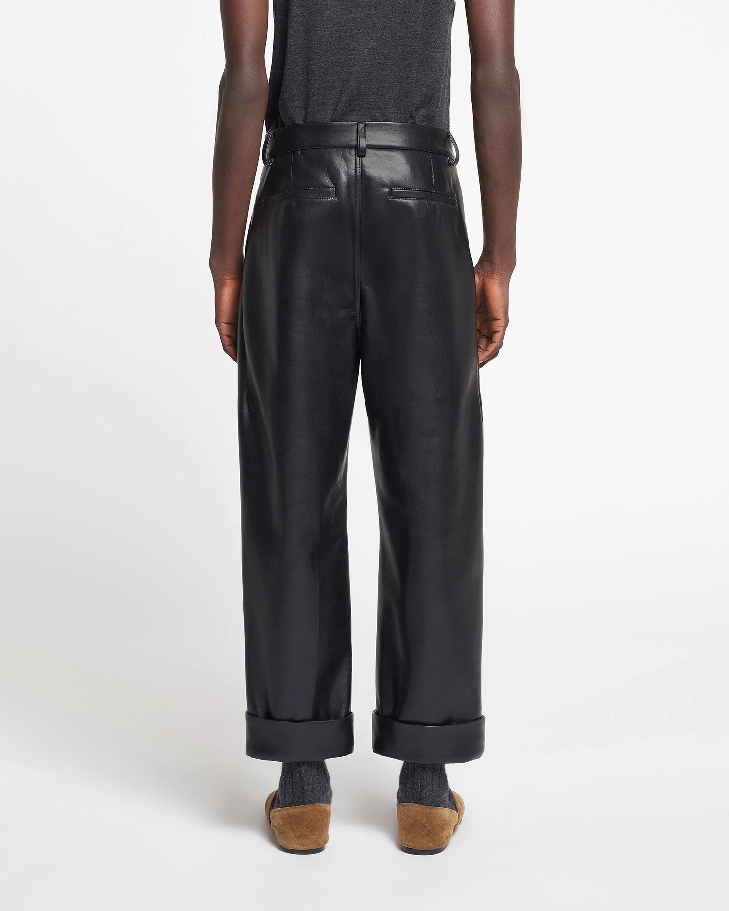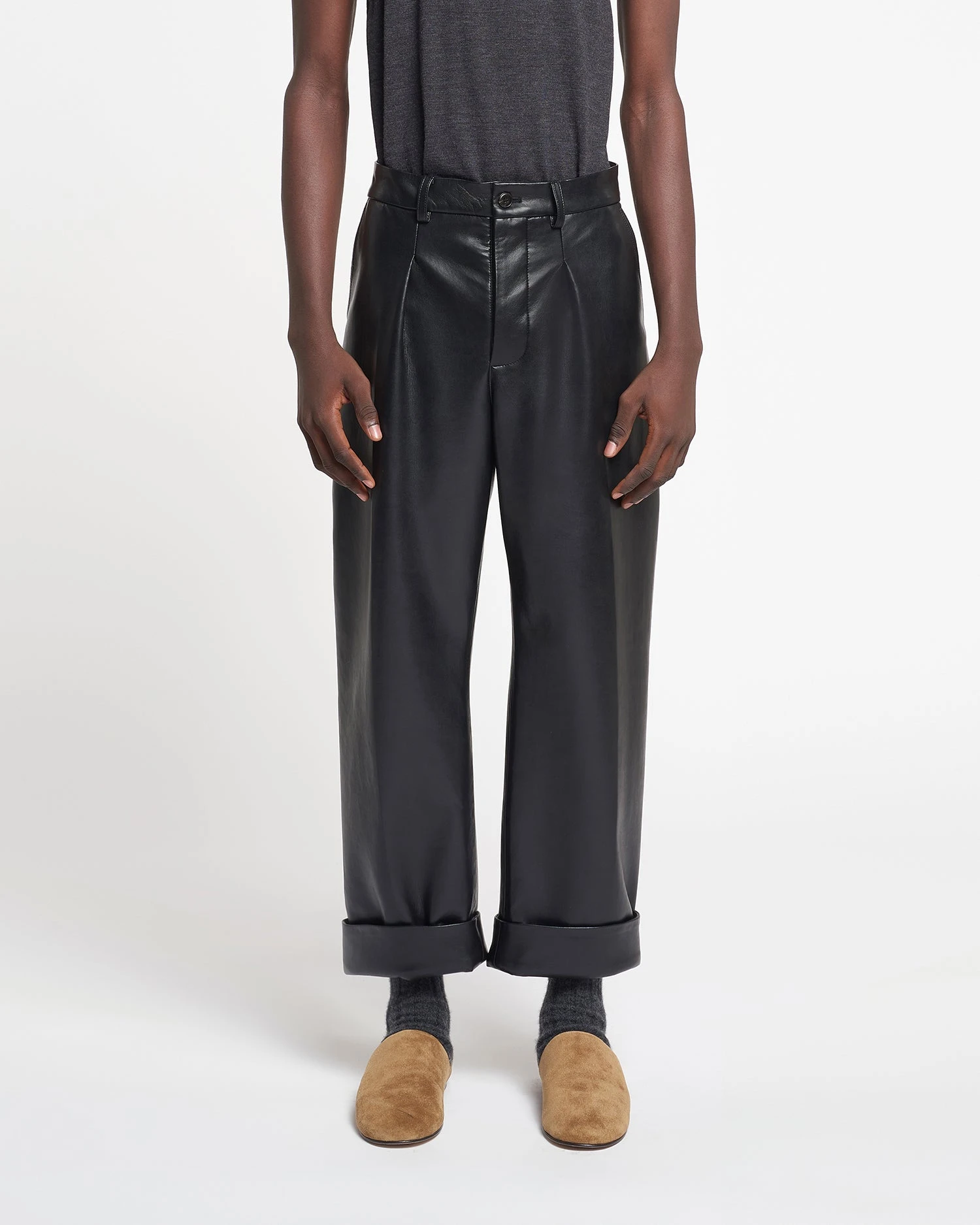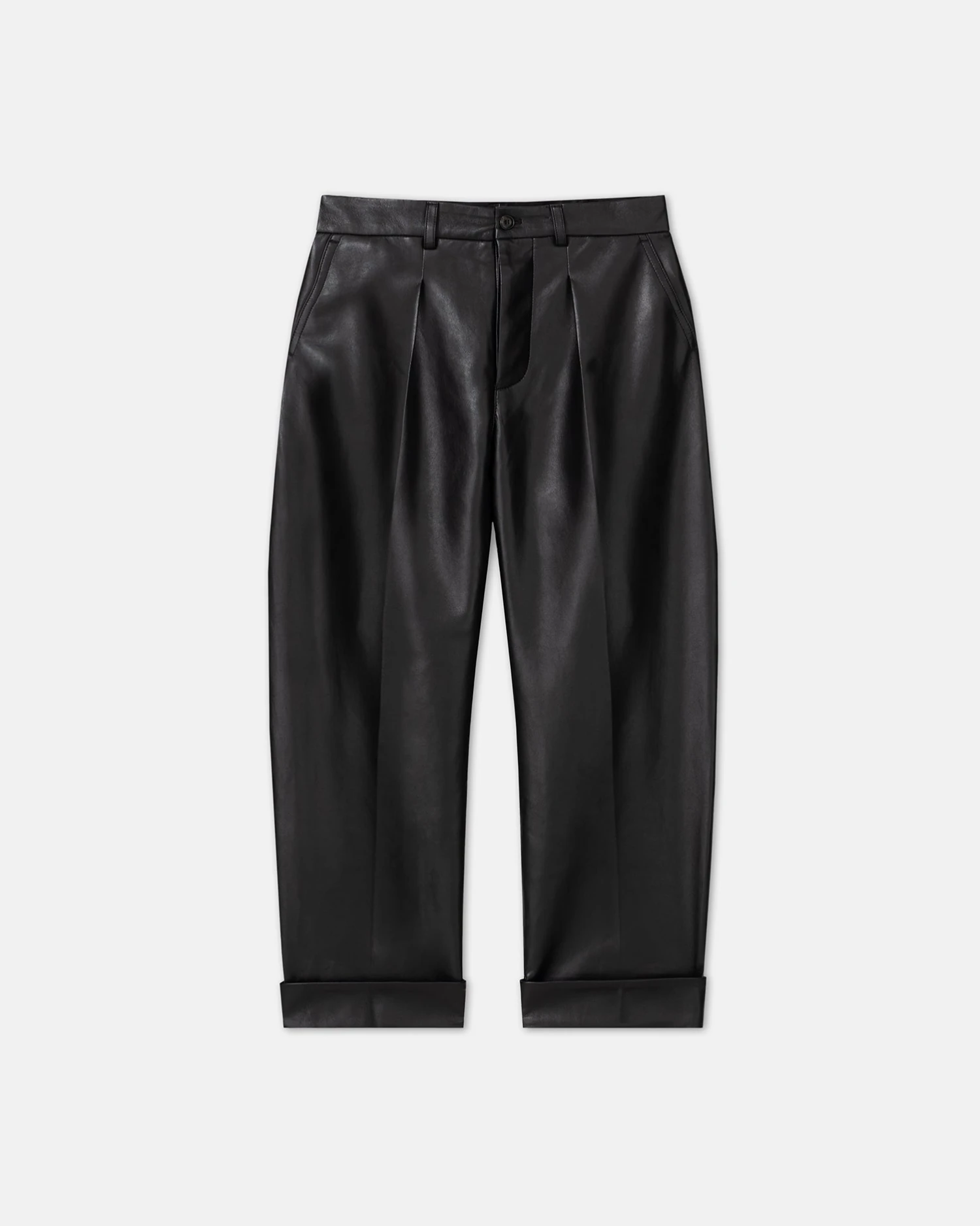 The Zayden pants showcase our definition of modern elegance. They are crafted from our signature regenerated leather and characterised by tapered barrel legs – accentuated by pressed creases and turn-up hems.