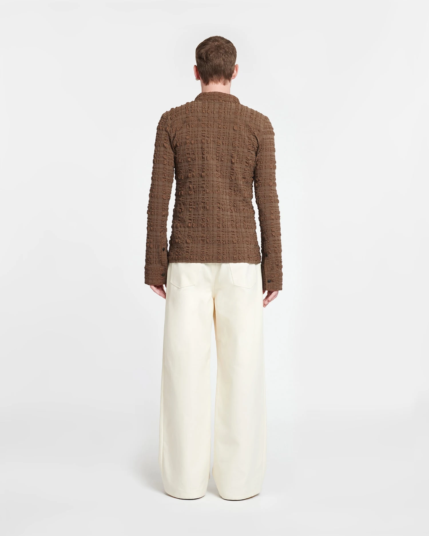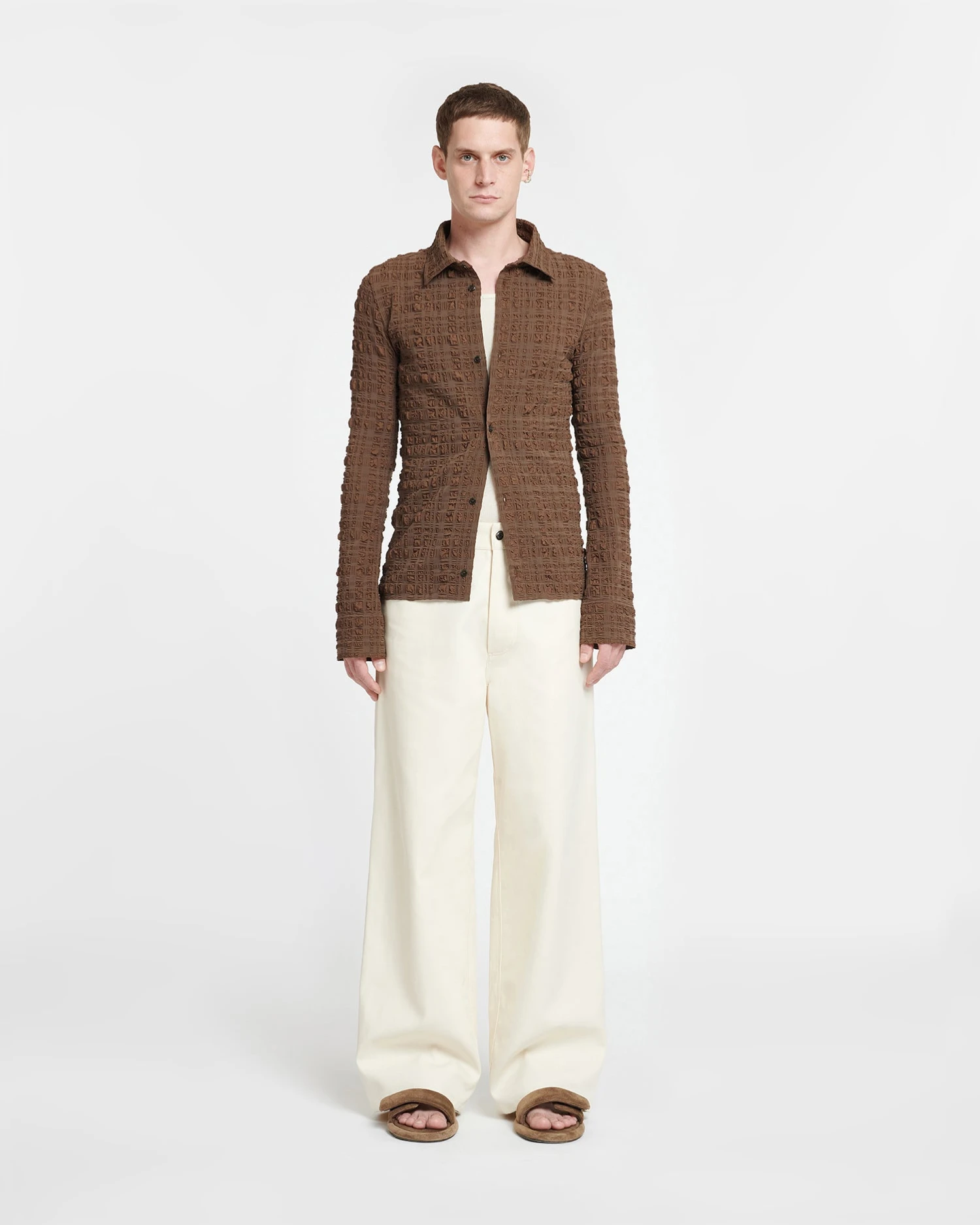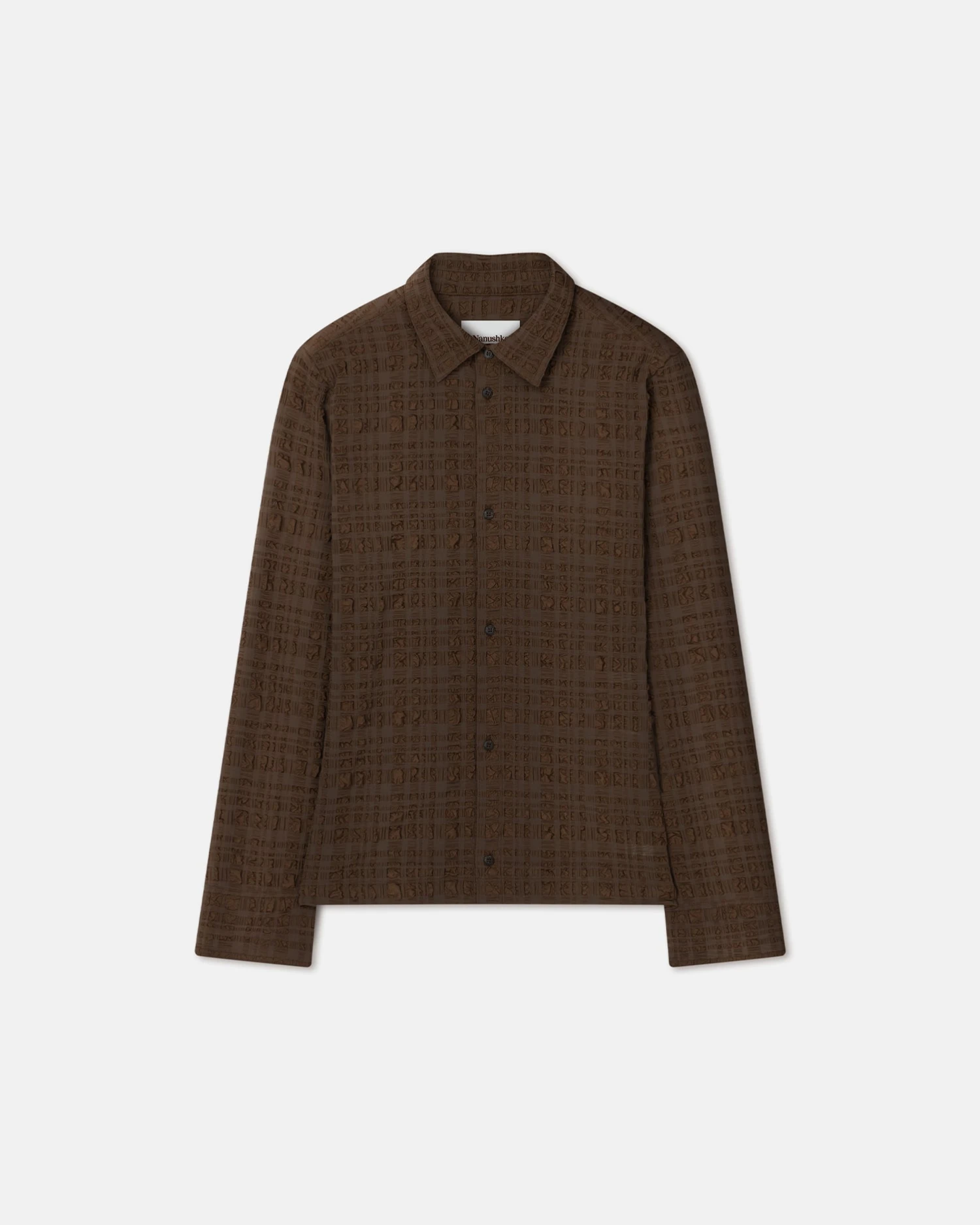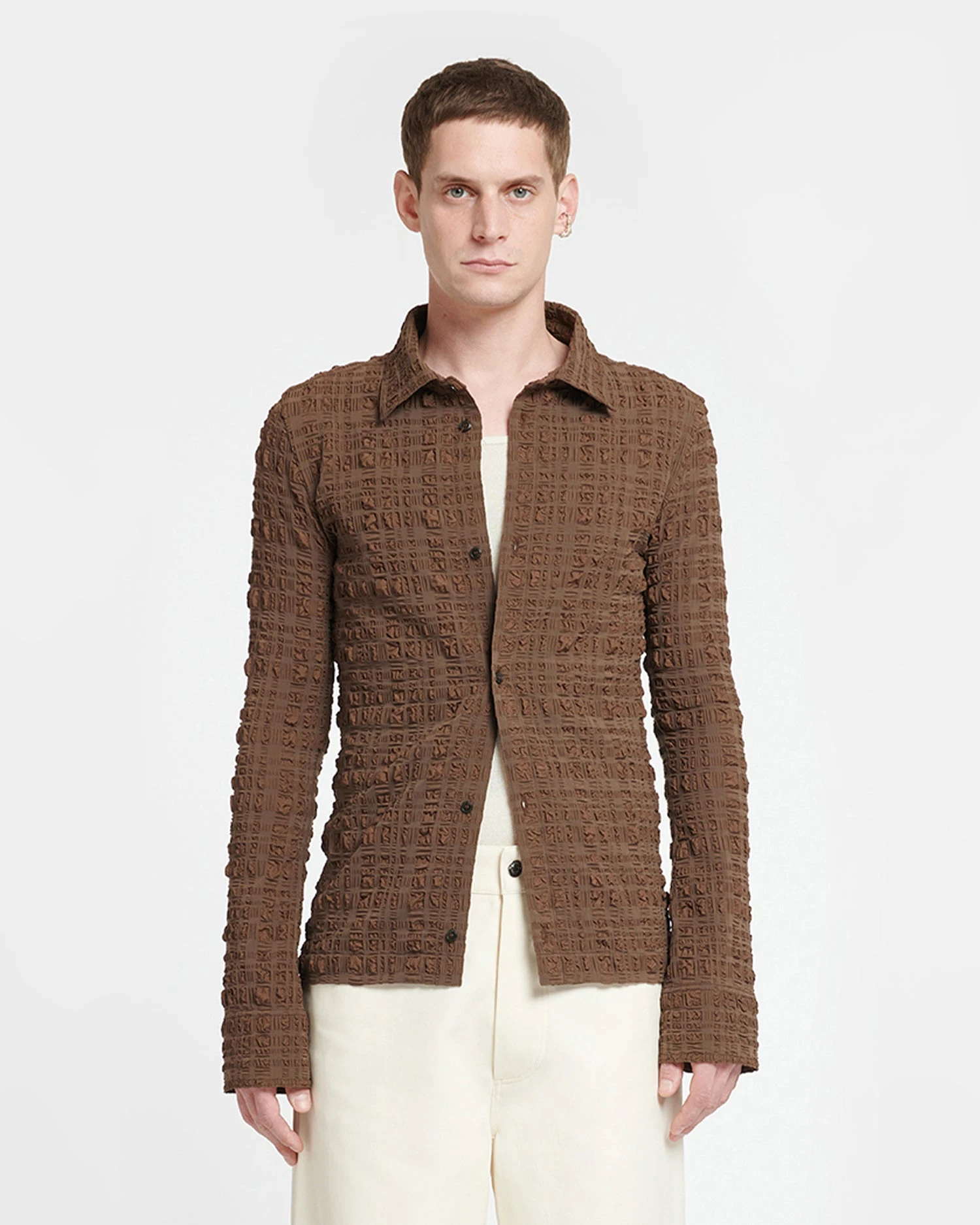 Texture manipulation is a long-standing Nanushka design code. The Zeph shirt is made from raised seersucker in dark-brown tone. It is cut for a close fit.